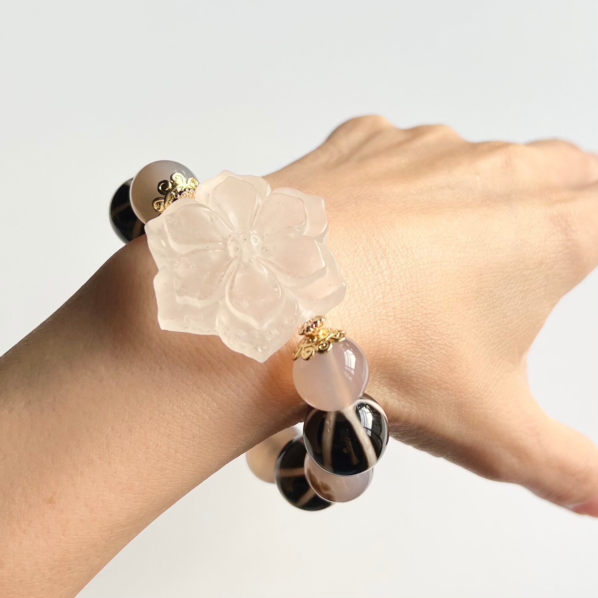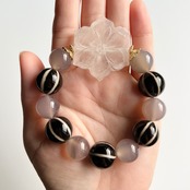 インパクトのある水晶の花彫りをモノトーンのブレスに仕上げました、黒の南瓜珠がどこかレトロで可愛いです