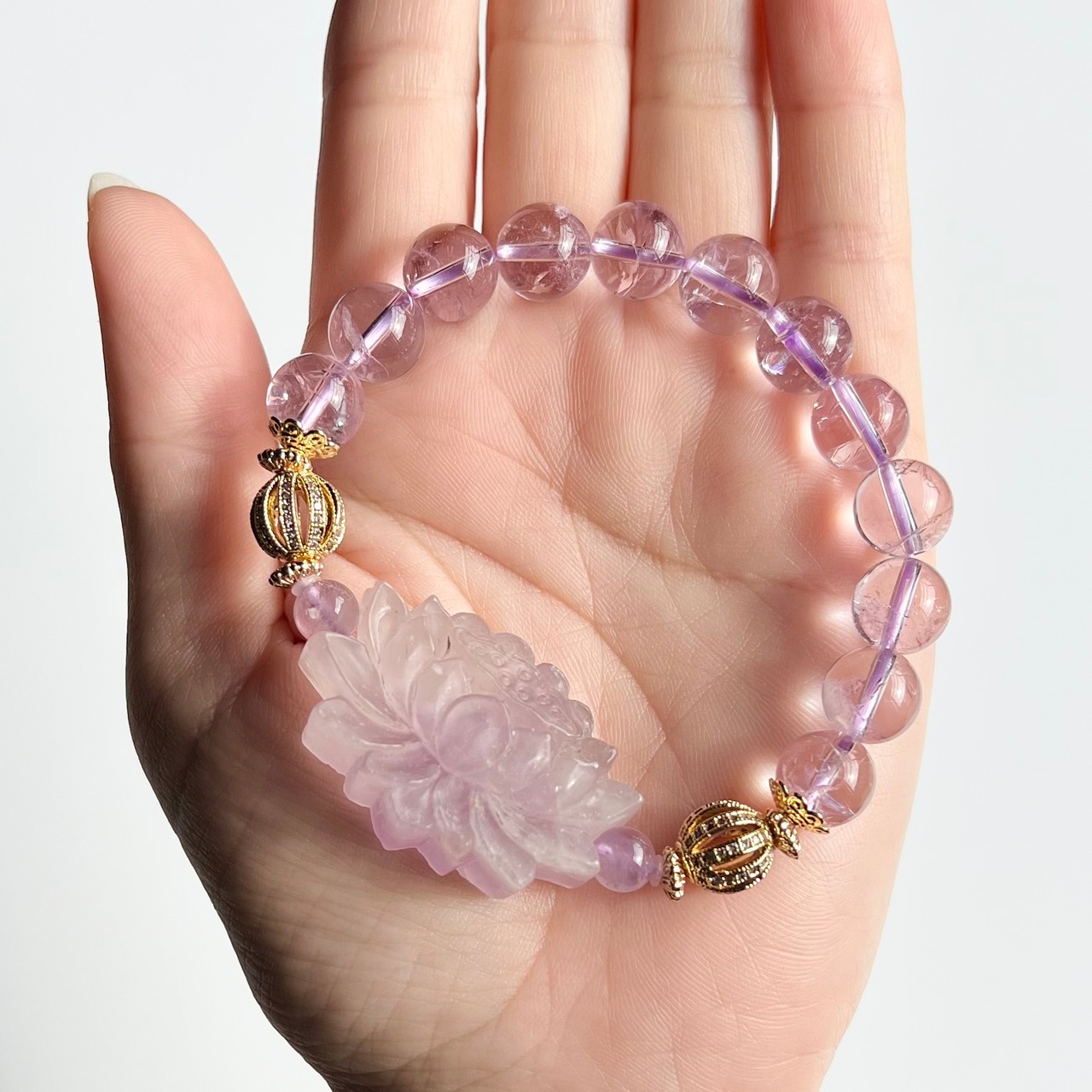 淡い紫色の蓮花彫刻とブレス部分に透明度の高い丸玉を使った、ラベンダーアメジストをお楽しみいただけるデザインブレスレットです