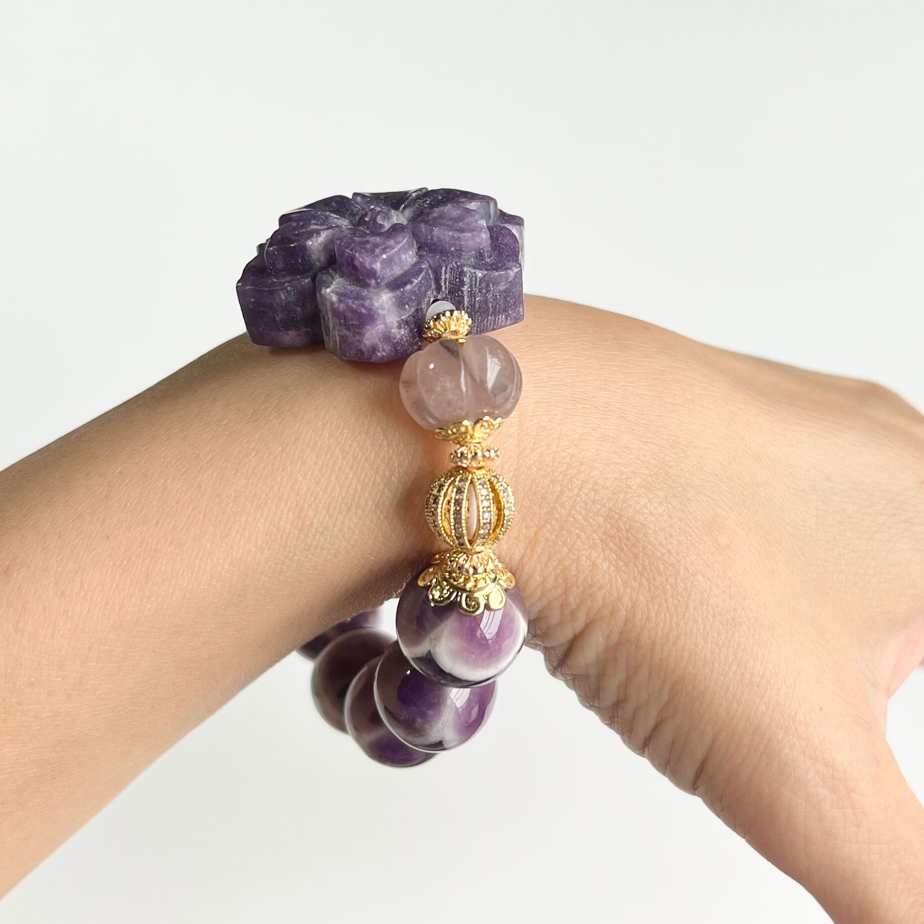 パープル好きさんにオススメな、レピドライトの花彫りと大玉シェブロンアメジストのブレスです