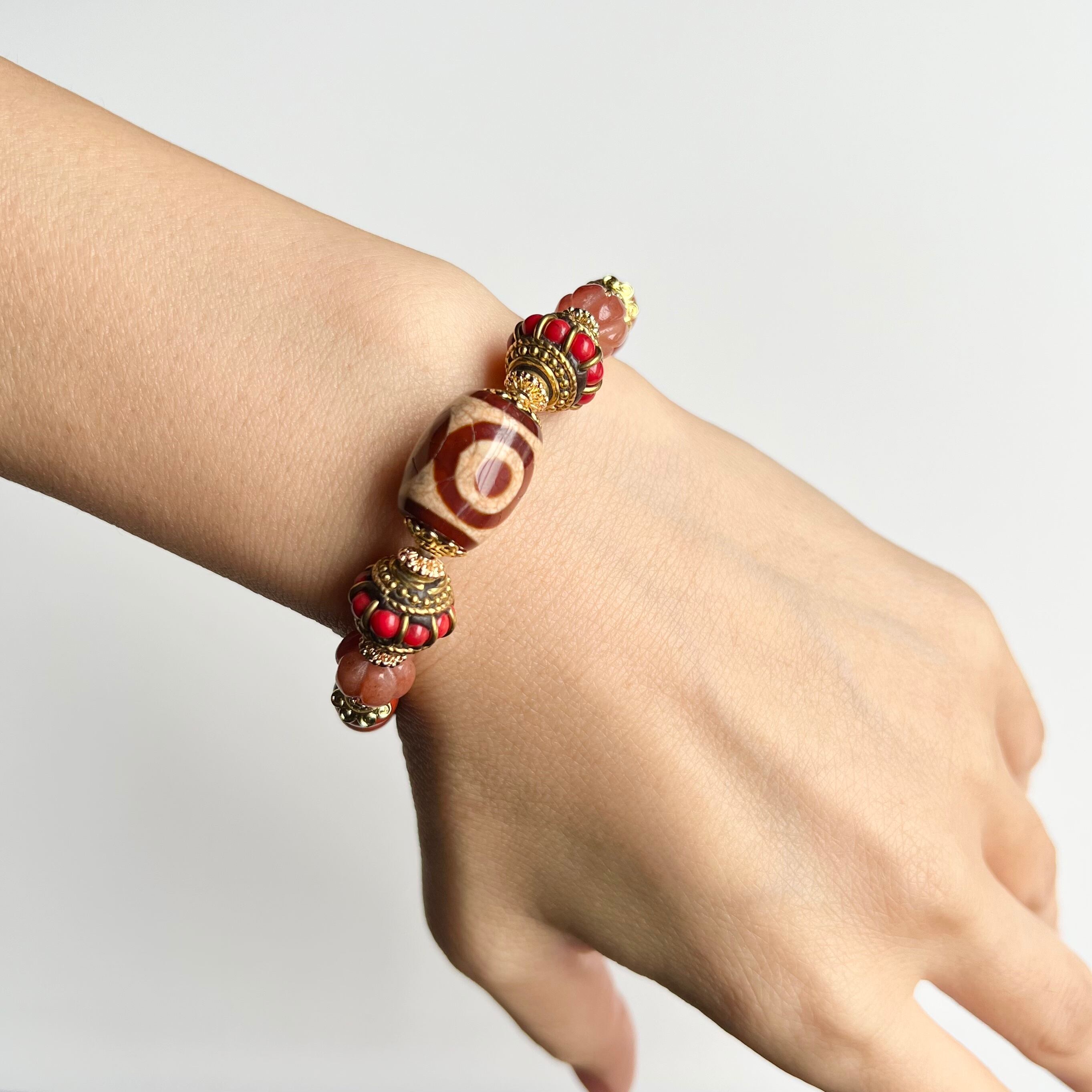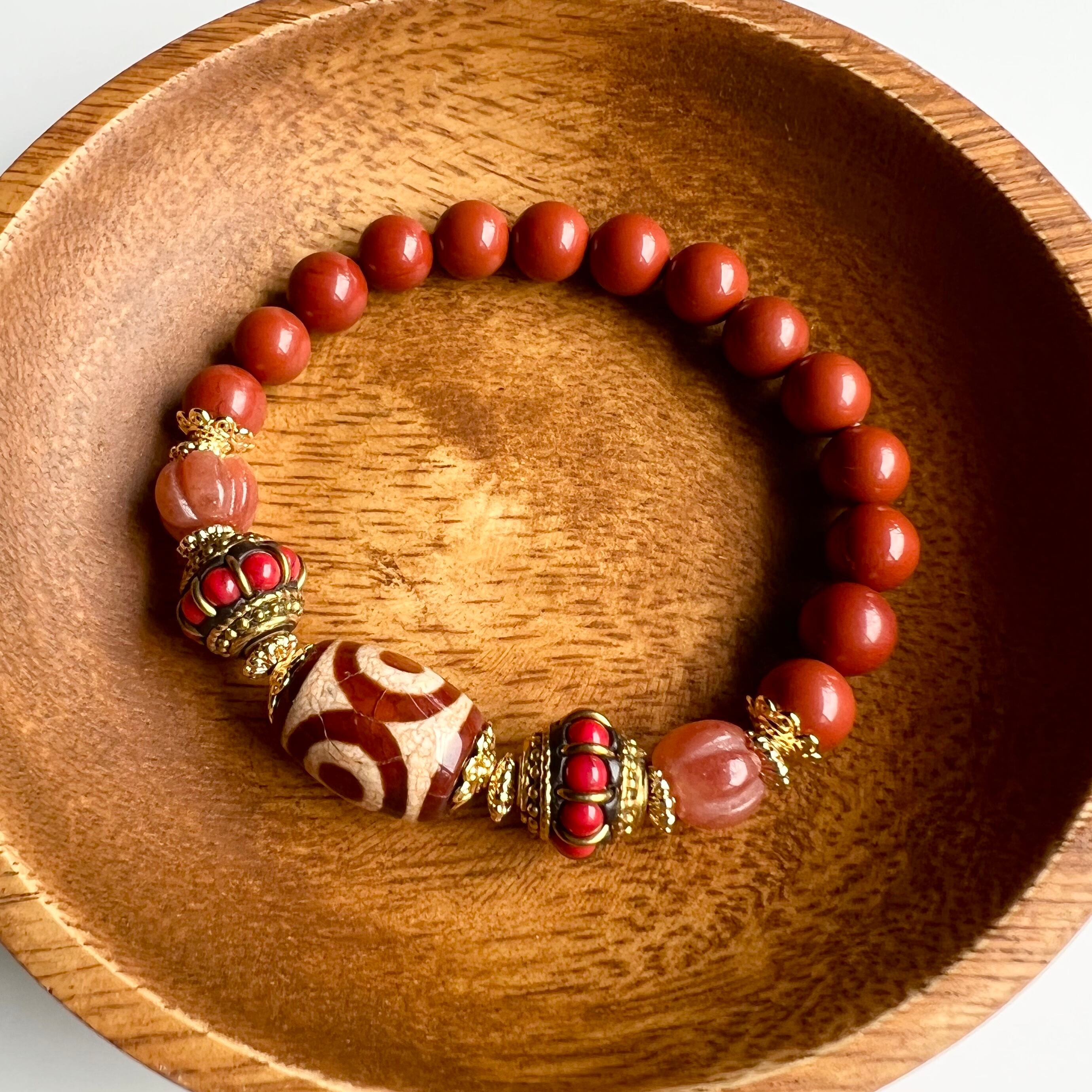 良い天珠をお探しの方にオススメな龍紋蓮花三眼天珠です、レッドジャスパーやアジアンビーズと組み赤を基調としたブレスに仕上げました