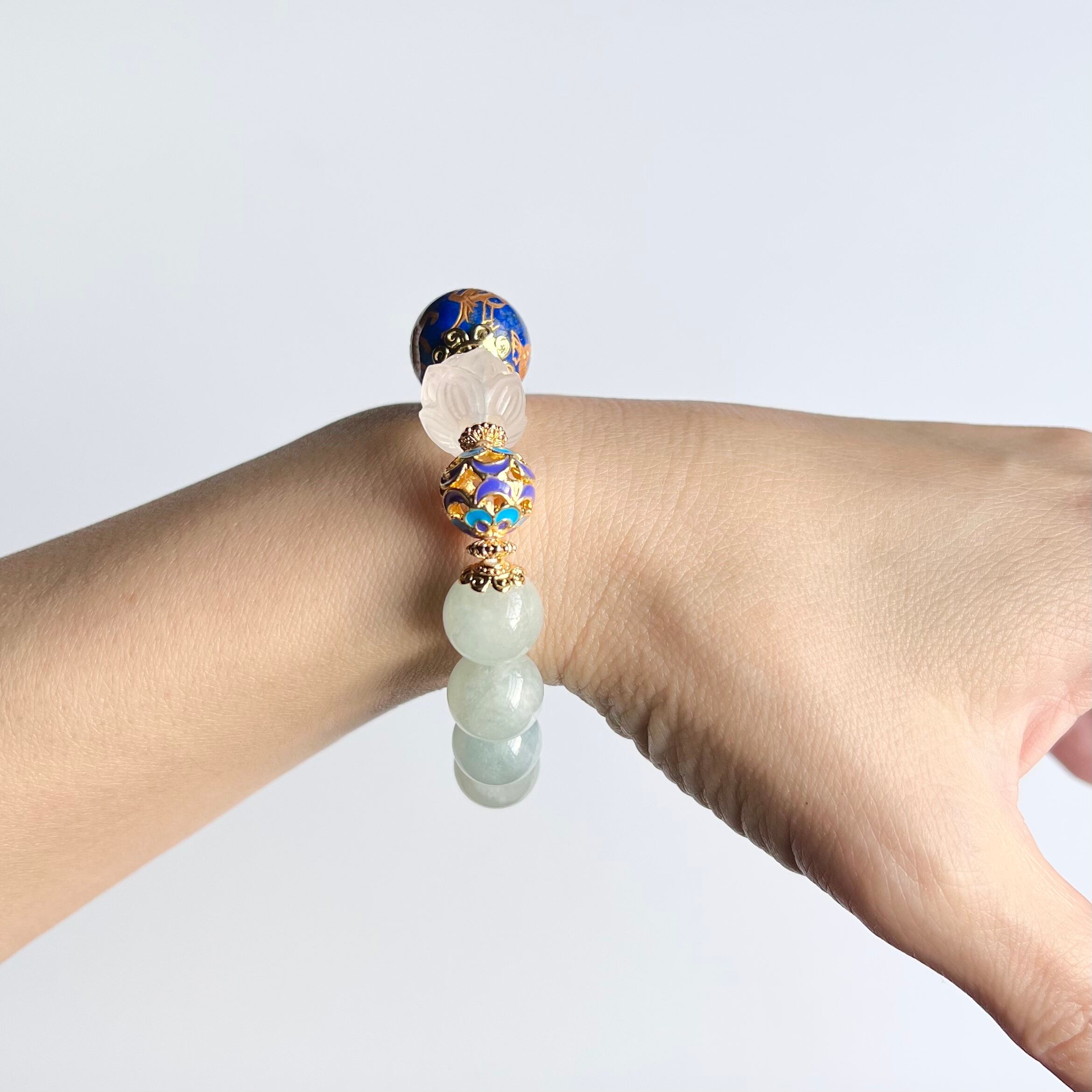 一玉に四神獣が施されたラピスラズリをメインに、水晶蓮花彫刻やアクアマリンで爽やかなブレスに仕上げました