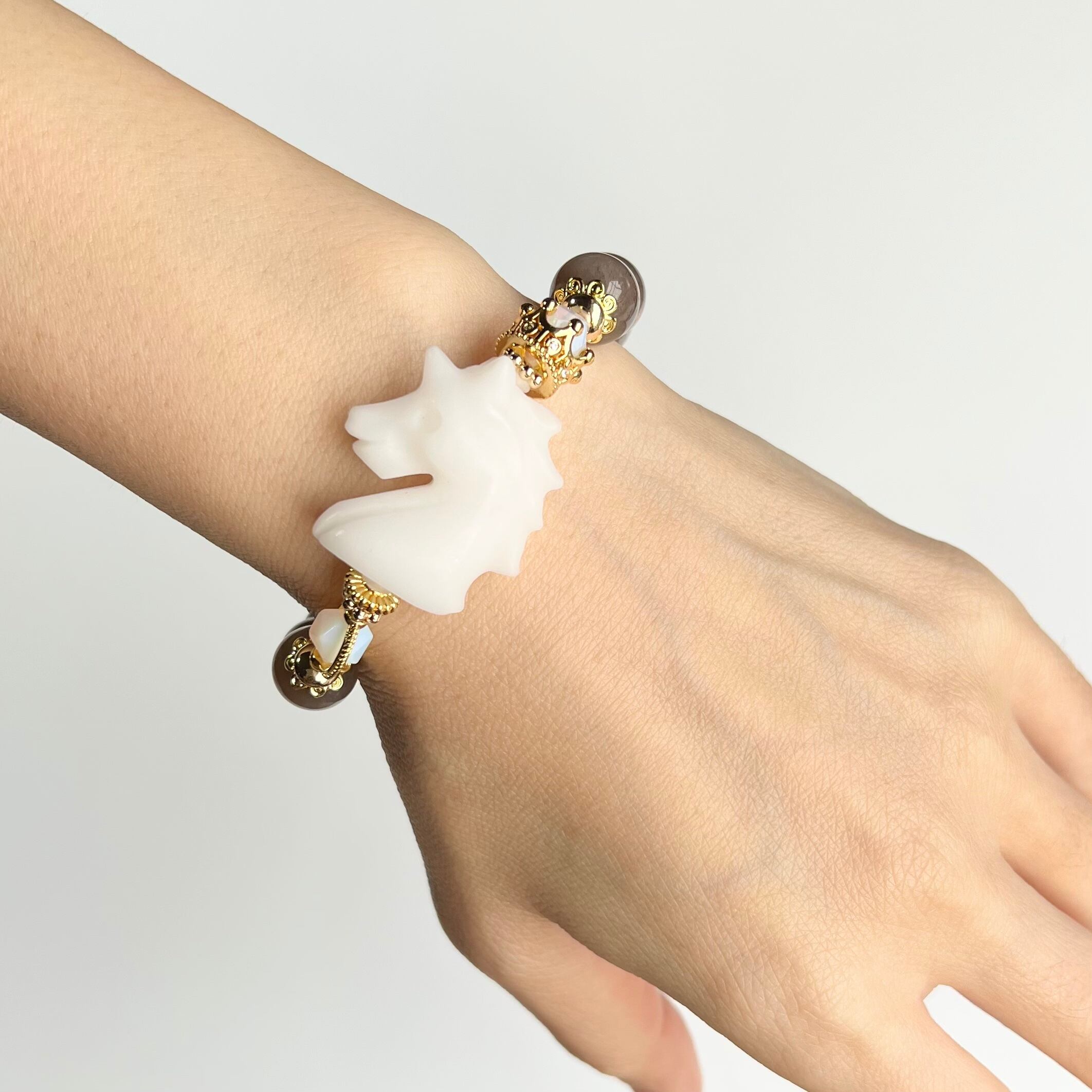 頭に王冠を乗せた水晶のユニコーンをシックな輝きのブラックサンムーンストーンでブレスにしました