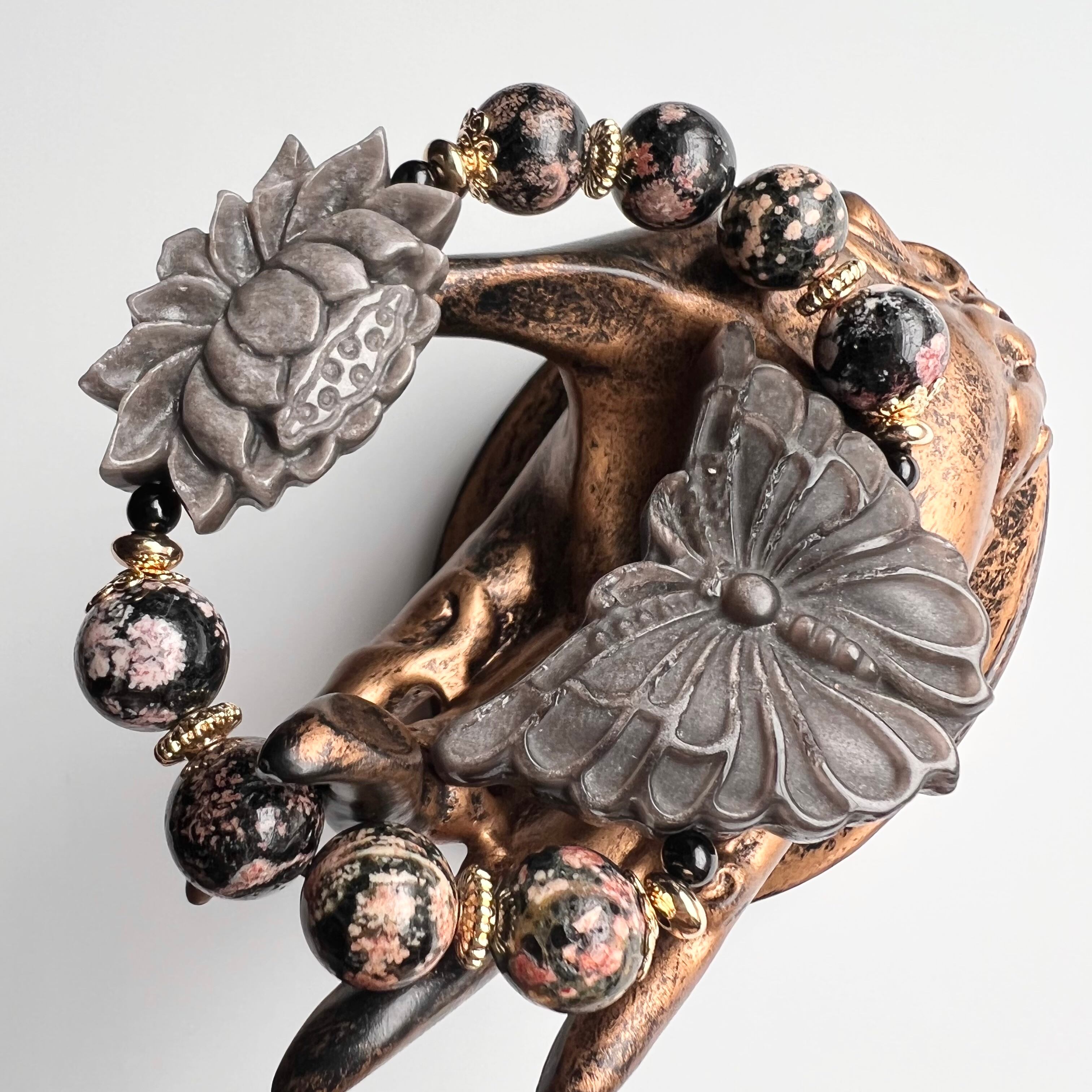 手首の内側にあたる蝶々の反対側に、同じくオブシディアンの蓮花彫刻をあしらいました