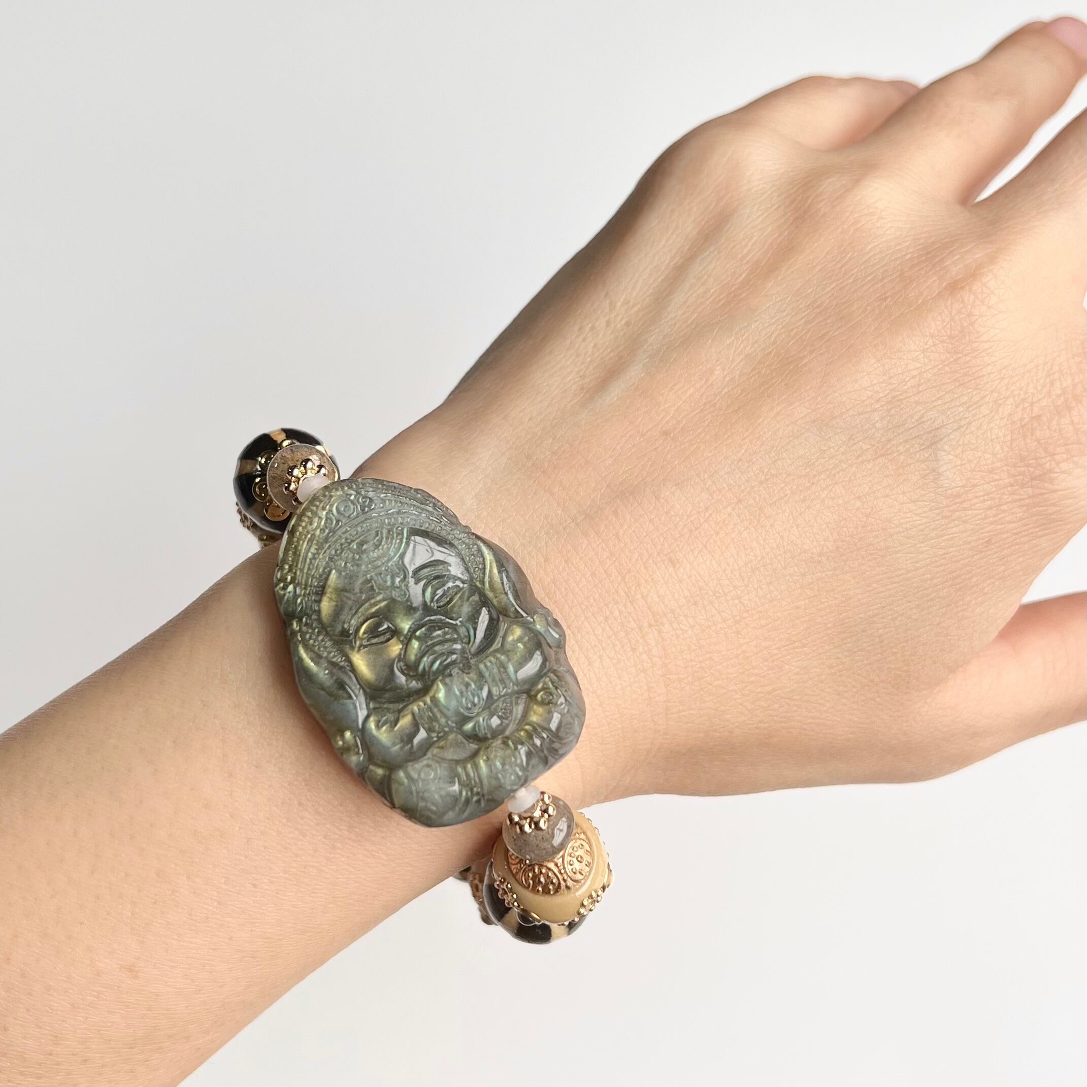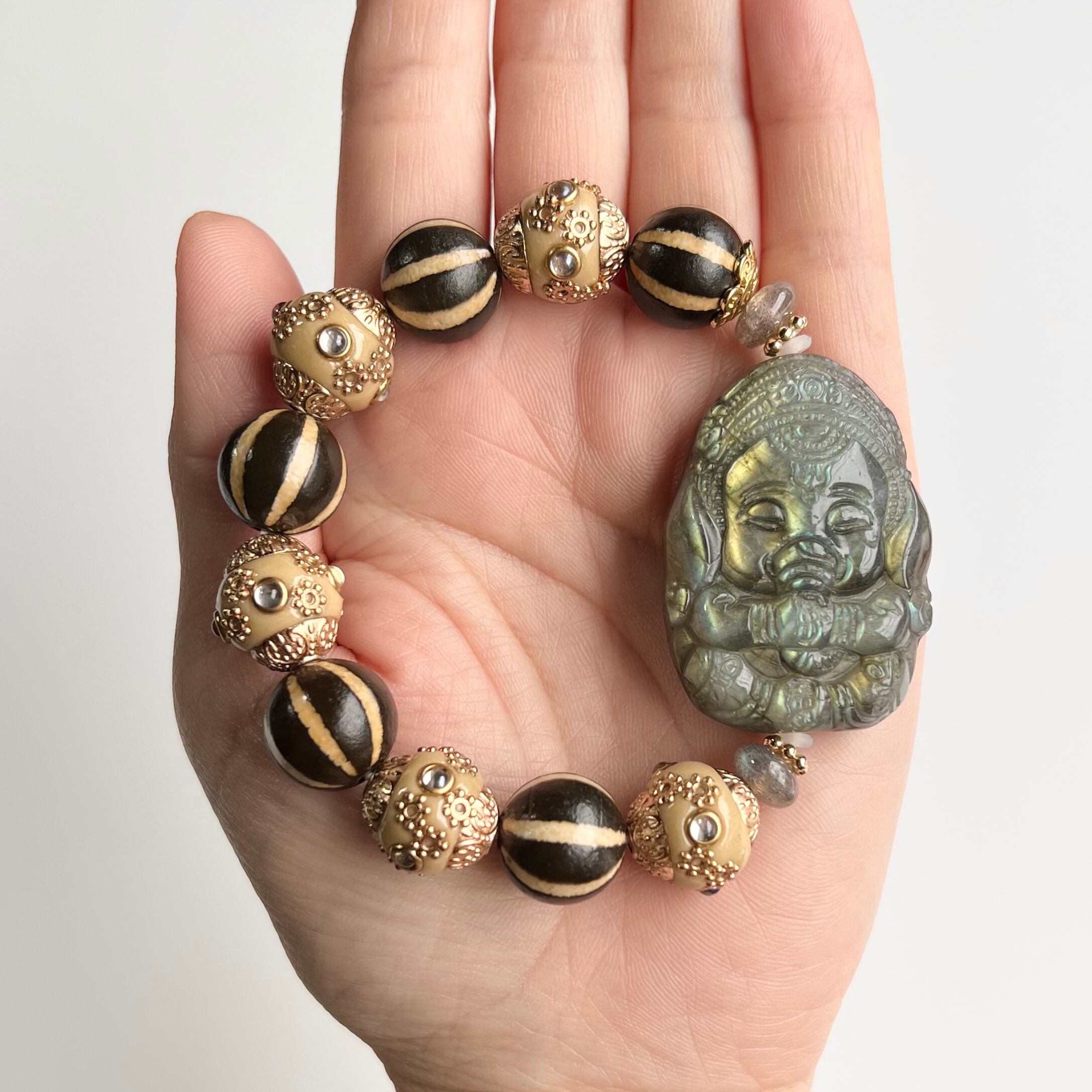 大きなラブラドライトのガネーシャを、南瓜珠天珠とインドネシアビーズでオリエンタルな雰囲気のブレスに仕上げました