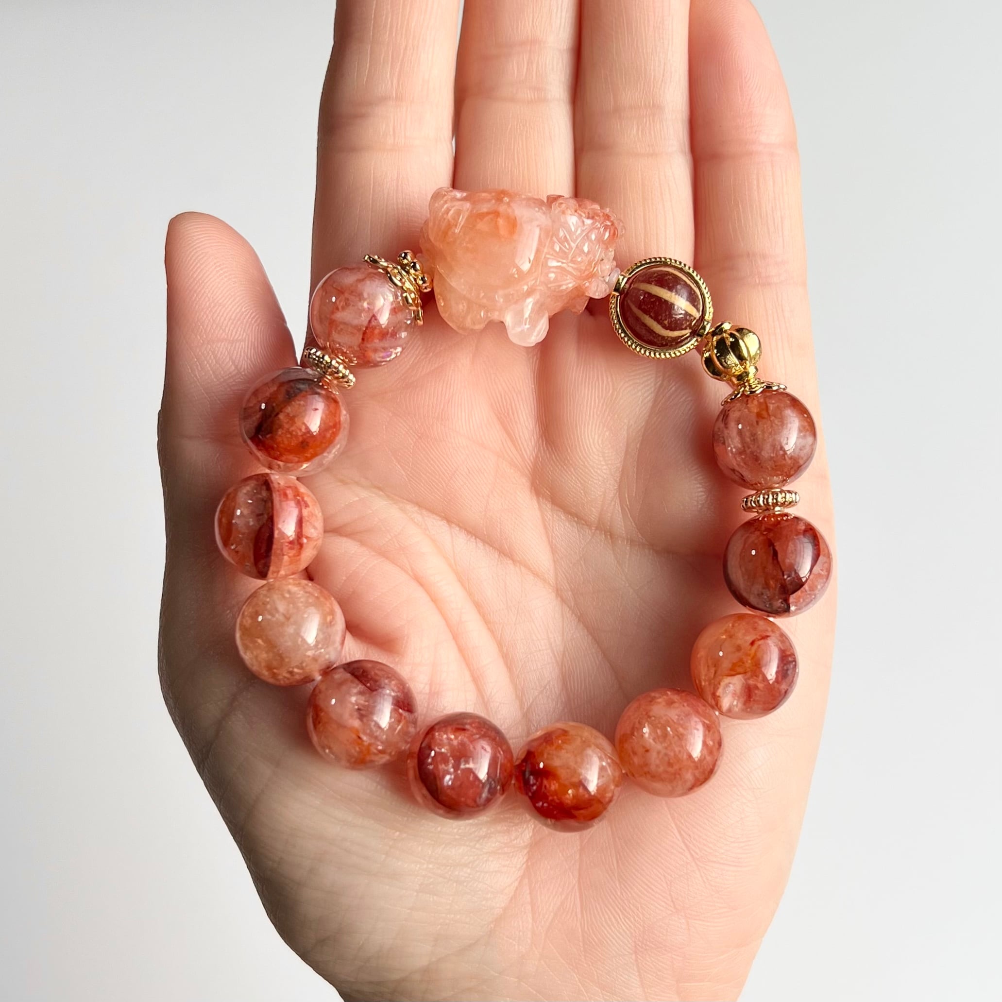 ブレス部分の赤黒いライモナイトがカッコよく、鉄分が赤いベールのようで幻想的な石ですね