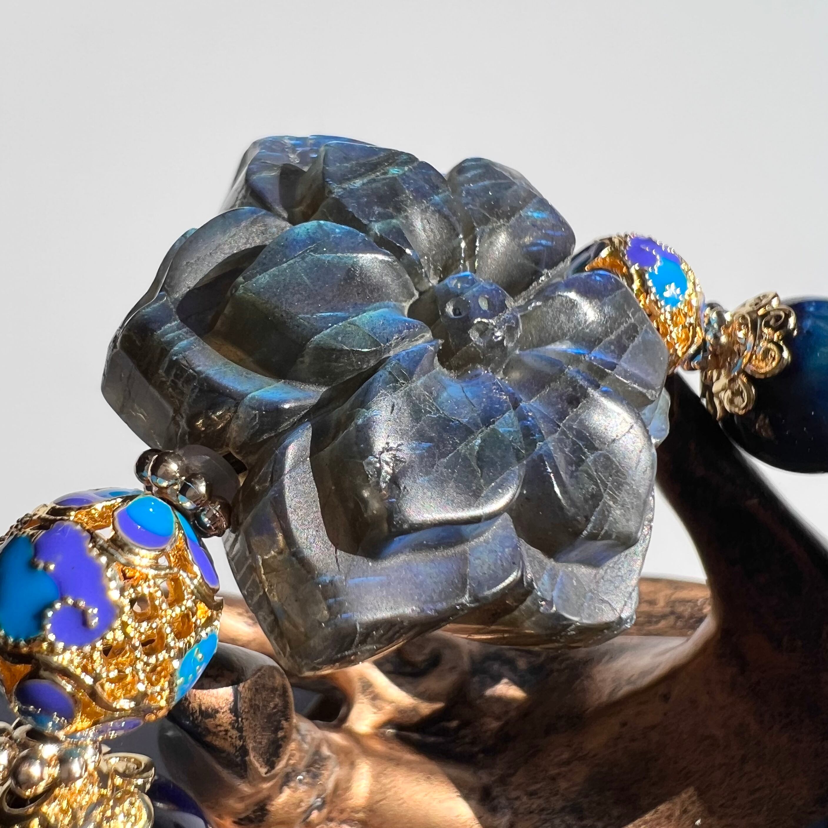 一面にブルーシラーがあらわれる綺麗なラブラドライト花彫りをメインに、ブルーをお楽しみいただけるブレスを作りました