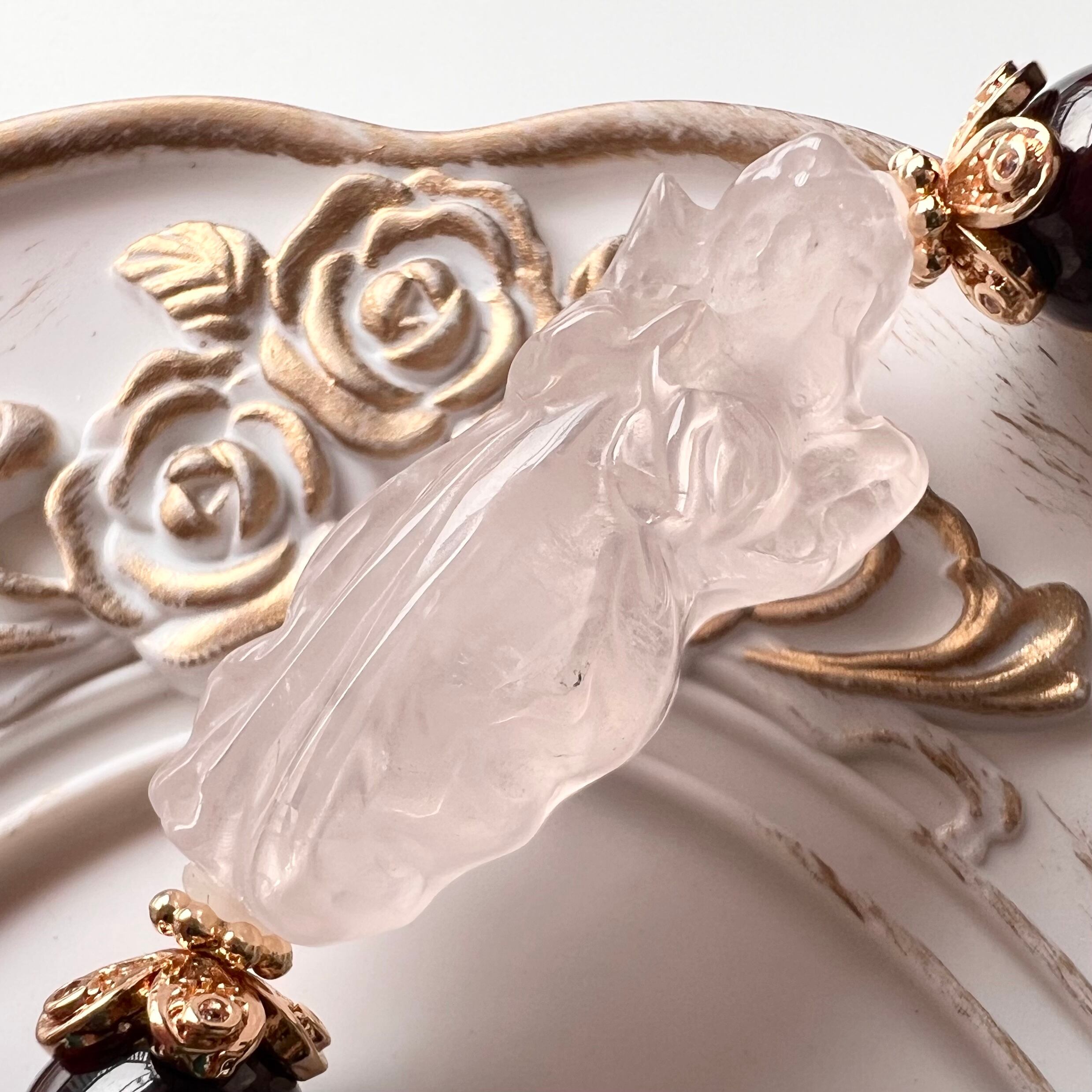 ローズクォーツの天使の彫刻とガーネットのブレスです