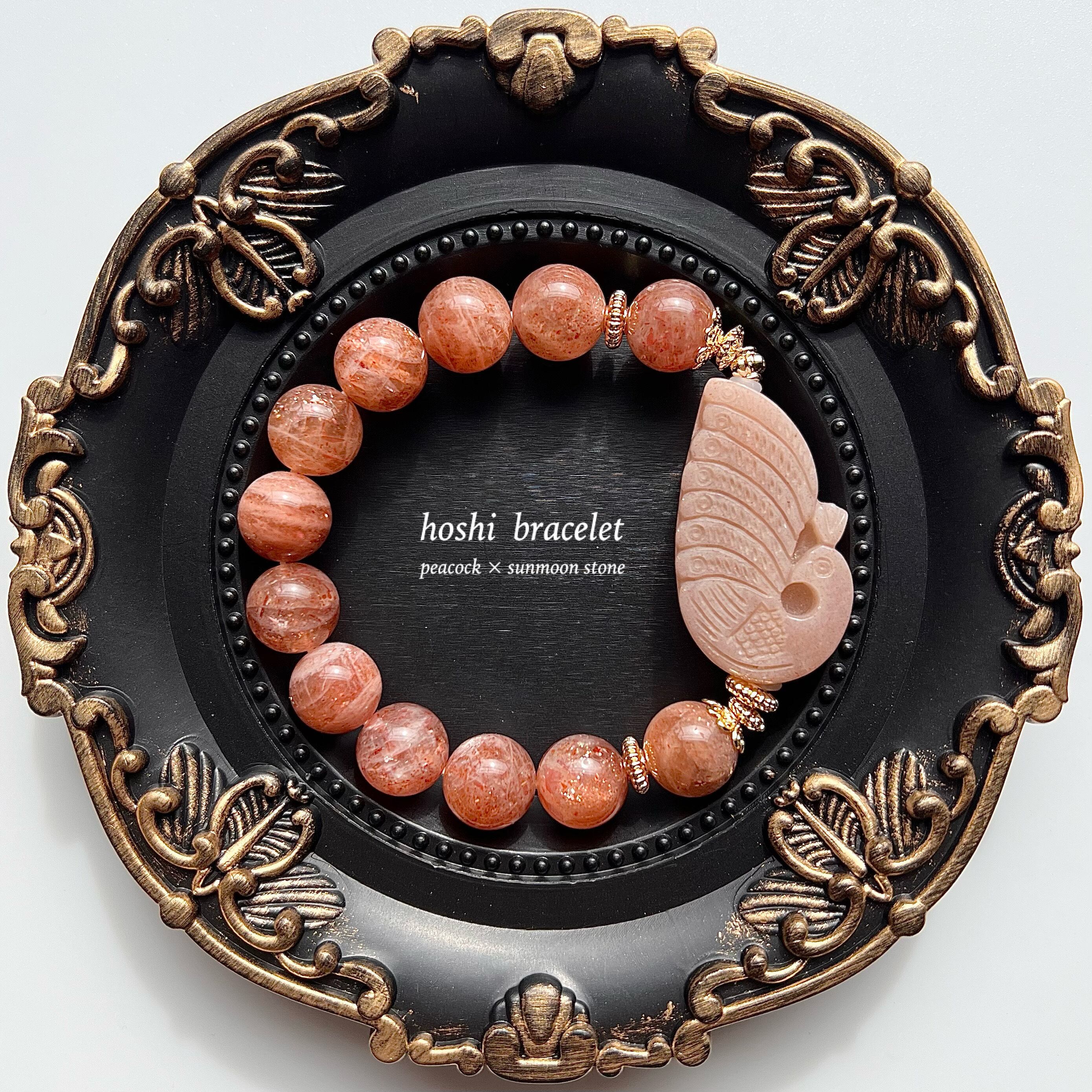 サンムーンストーンの孔雀の彫刻とサンストーンのブレスです