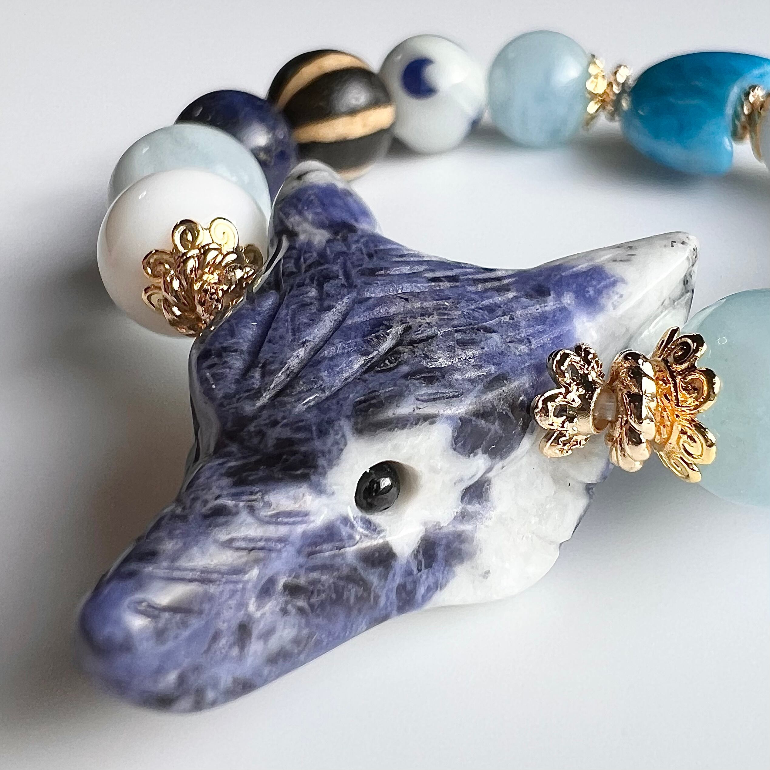 ソーダライトのオオカミを色んな石(貝)でブレスにしました