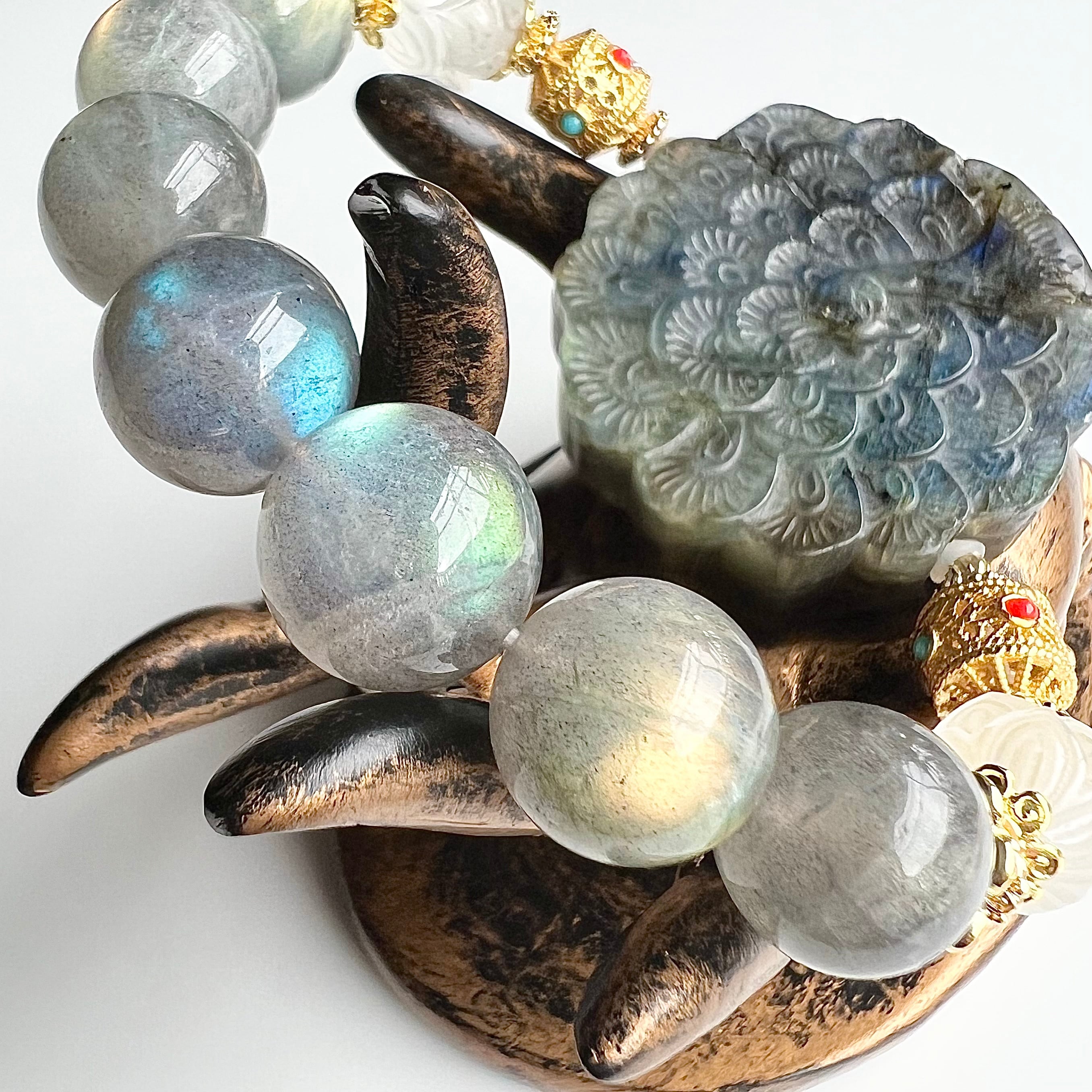 大きな孔雀の彫刻をメインにしたラブラドライトのデザインブレスレットです