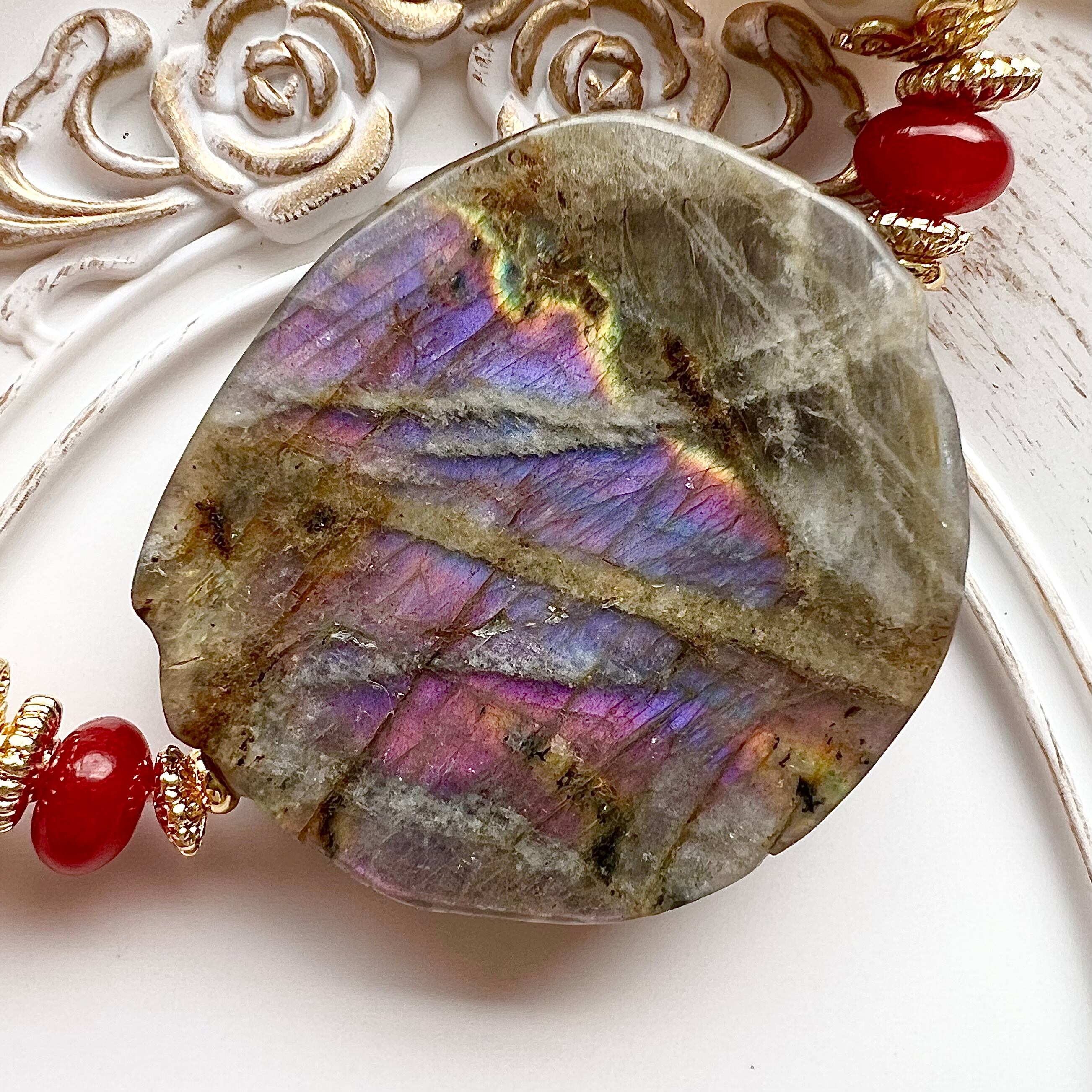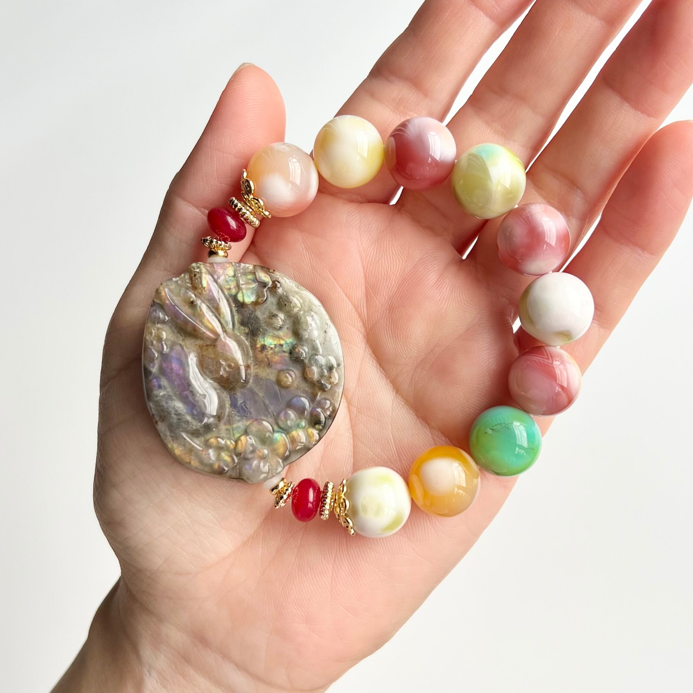 大きなラブラドライトのウサギの彫刻と、キャンディソルトアゲートのデザインブレスレットです