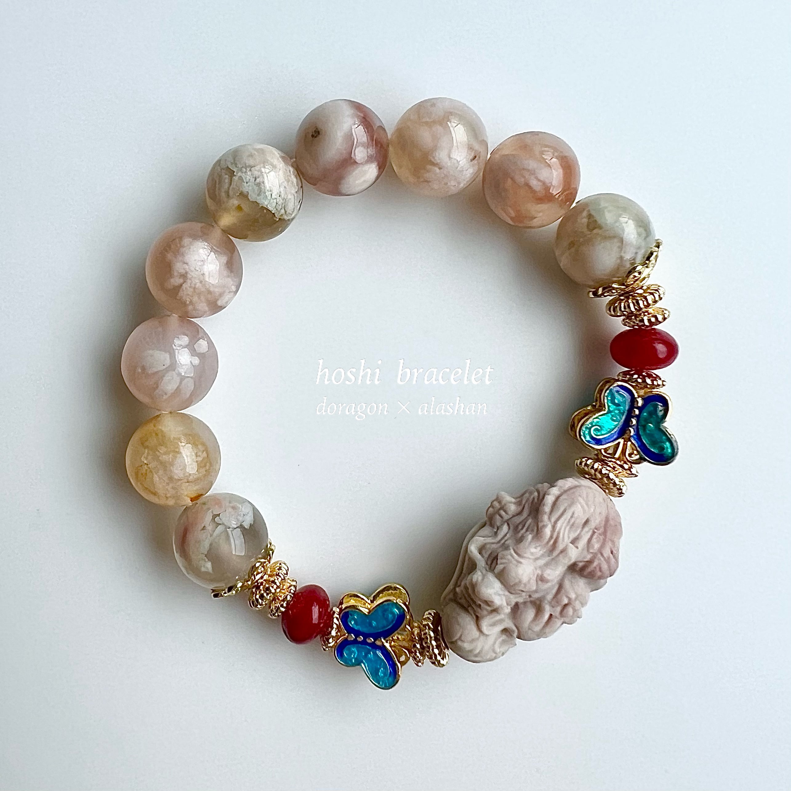 アラシャン瑪瑙の龍彫りと桜瑪瑙のデザインブレスレットです