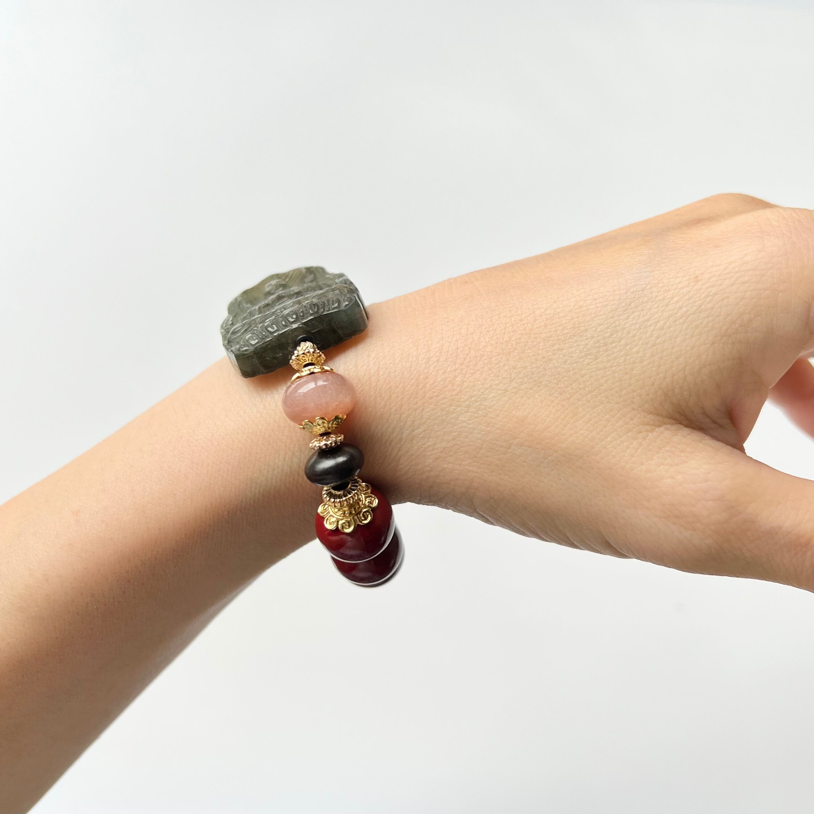ラブラドライトの彫刻とシナバーのデザインブレスレットです