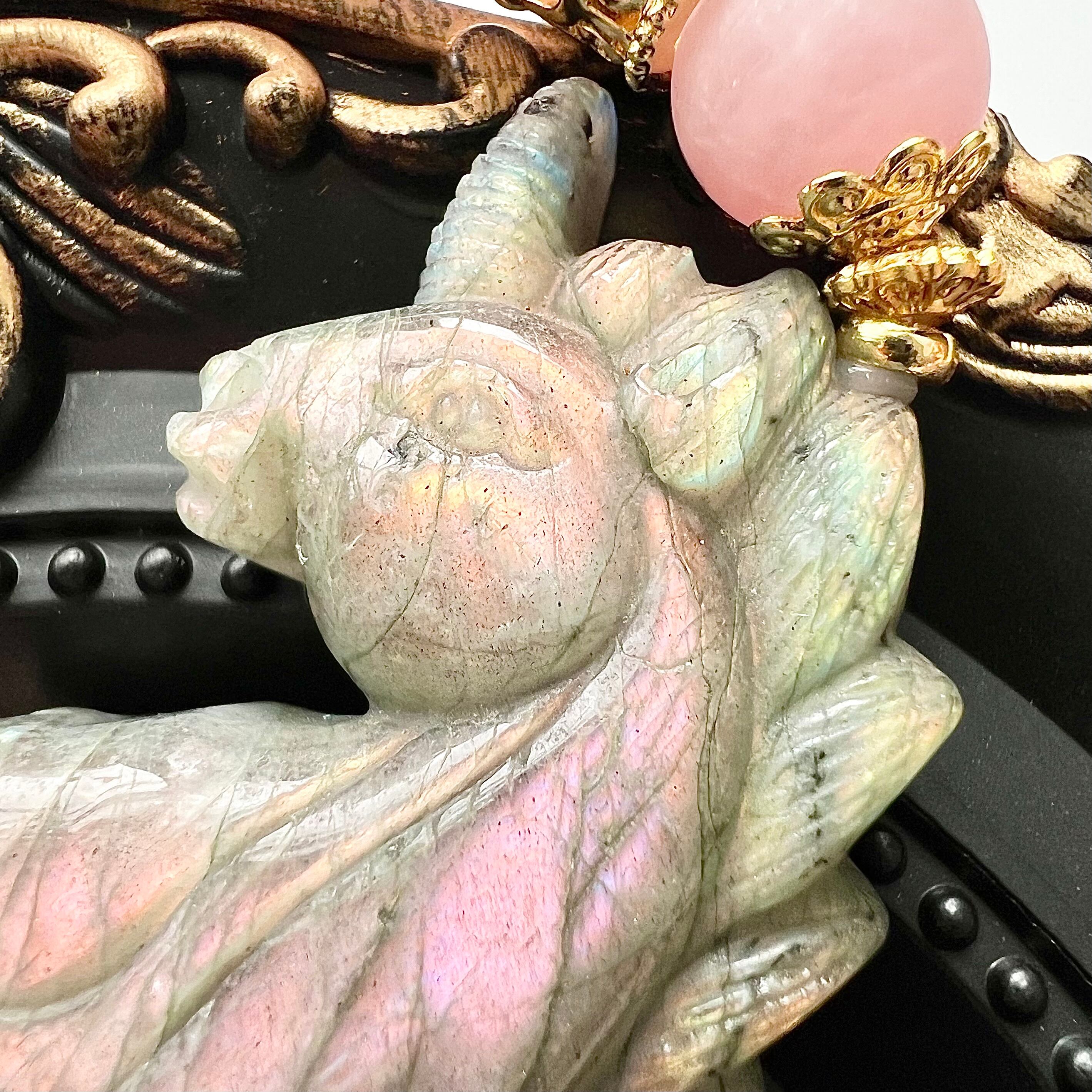 ラブラドライトのユニコーン彫刻とディープローズクォーツのデザインブレスレットです
