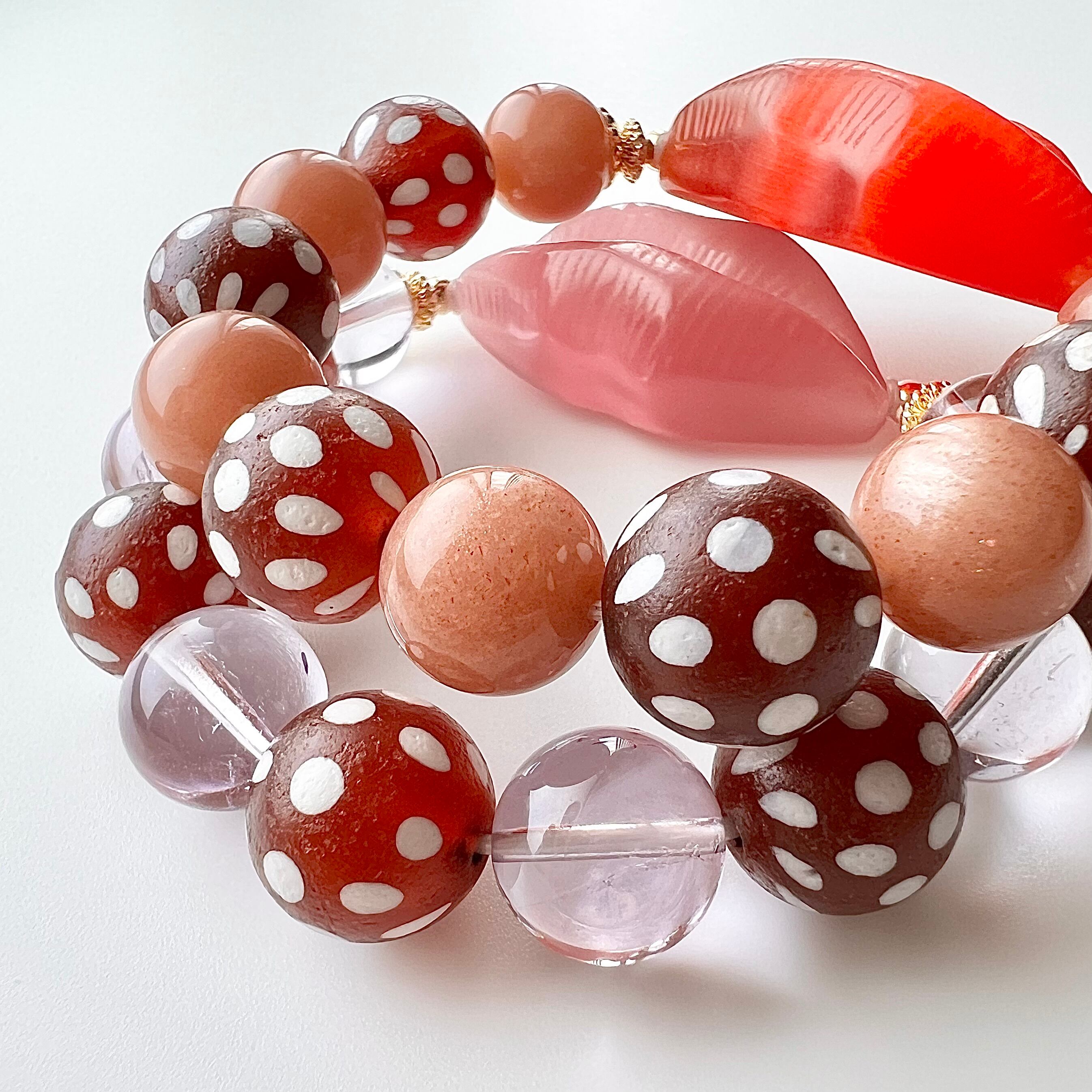 その間に水玉模様の赤い満天天珠をはさむと、遊び心のある大人の女性でもお楽しみいただけるブレスに仕上がりました