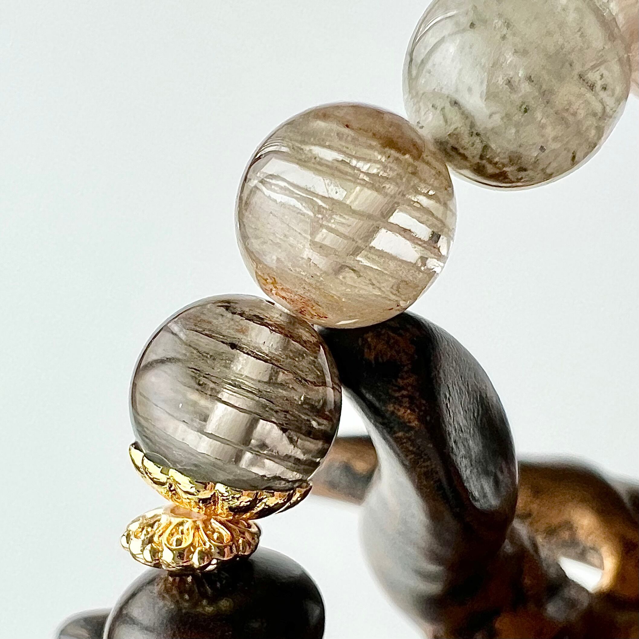 その俵型ガーデンに負けないよう、ブレスの丸玉も小玉ながら透明度が高い千層ガーデンクォーツを選びました