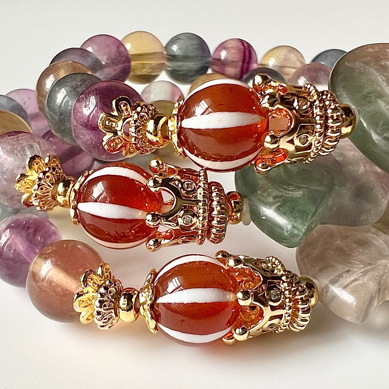 他にもブレスが華やかになるよう赤瑪瑙の南瓜珠線珠やゴールドパーツをアクセントに加えました