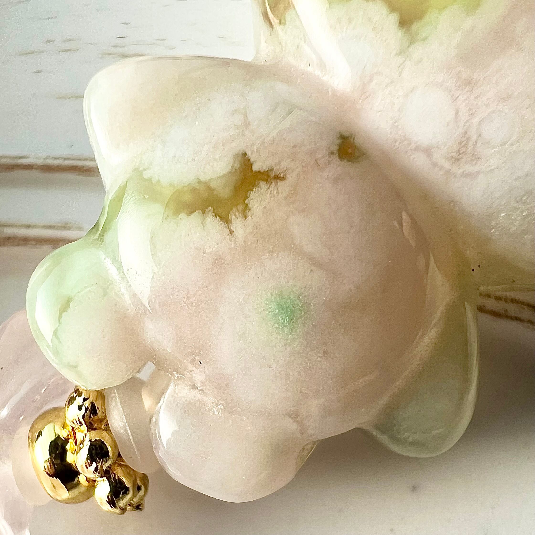 目を閉じた大きな耳のウサギは半身グリーン、もう半身のピンク桜瑪瑙にはたくさん咲いた小花のような内包物がぎっしり詰まっています
