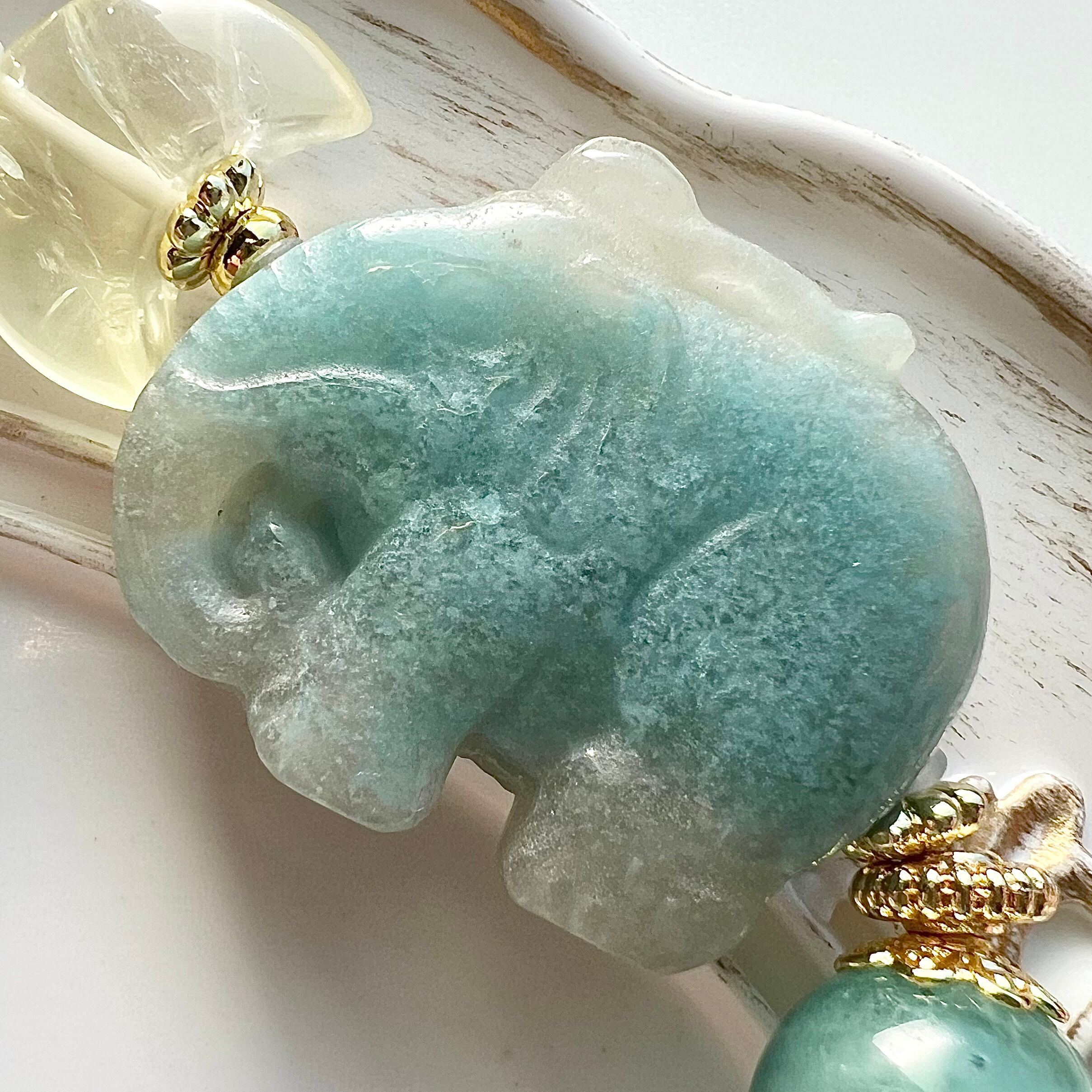 他にも夜空をイメージし、象の隣に黄色いレモンクォーツの三日月と、ミックスベリルの中に黄色瑪瑙の日月星天珠をあしらいました