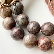 他にもアジア圏の装飾をイメージし、塩源瑪瑙のパンプキンカットやレッドカルセドニーのボタンカットなどで華やかさを加えました