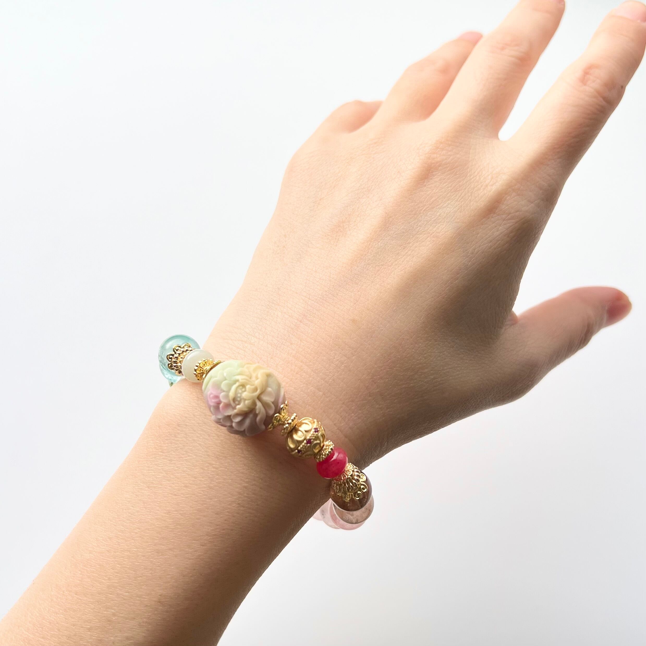 塩源瑪瑙の牡丹×鳳凰彫刻とミックストパーズのデザインブレスレットです