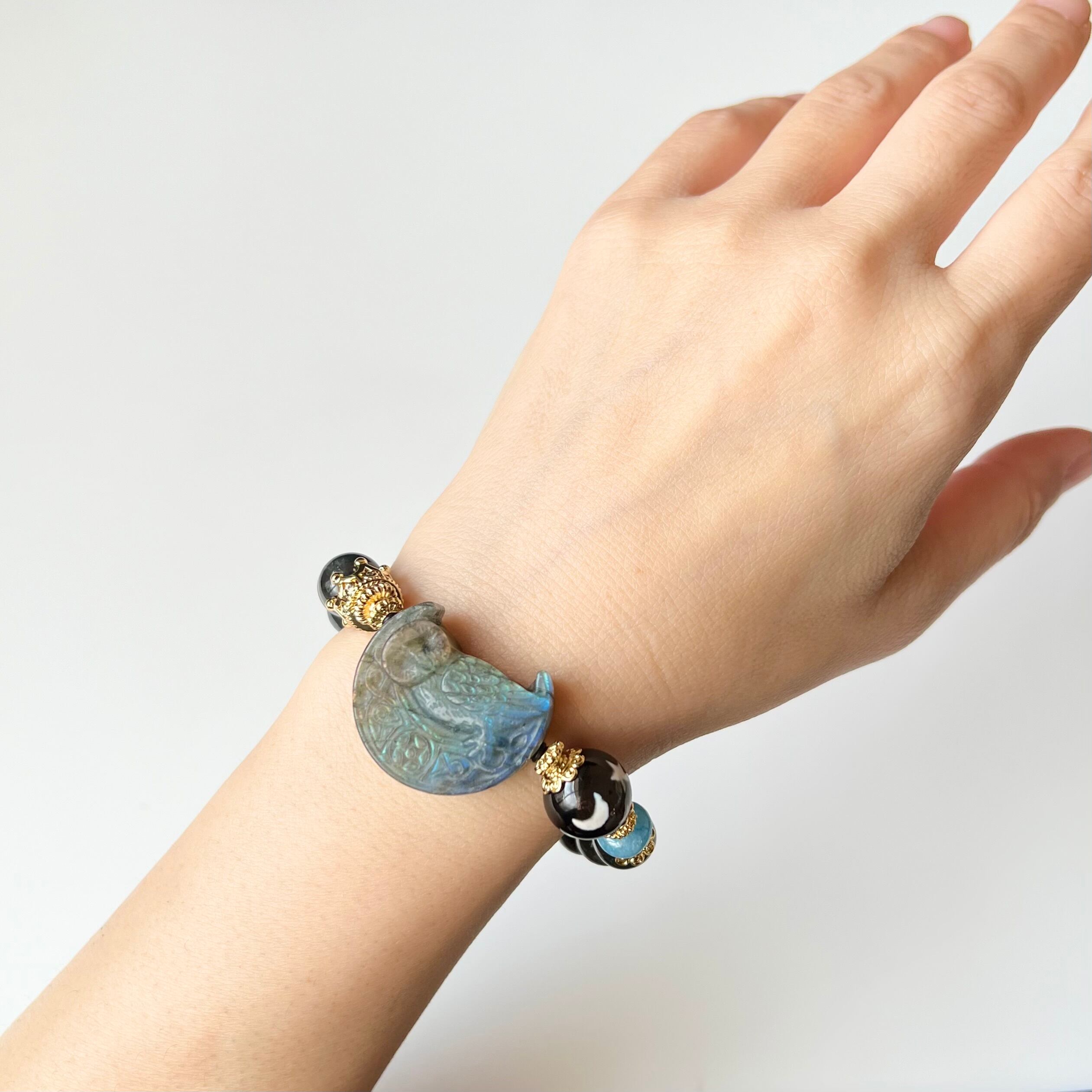三日月とフクロウ ラブラドライト ブラックラブラドライト 天然石 ブレスレット