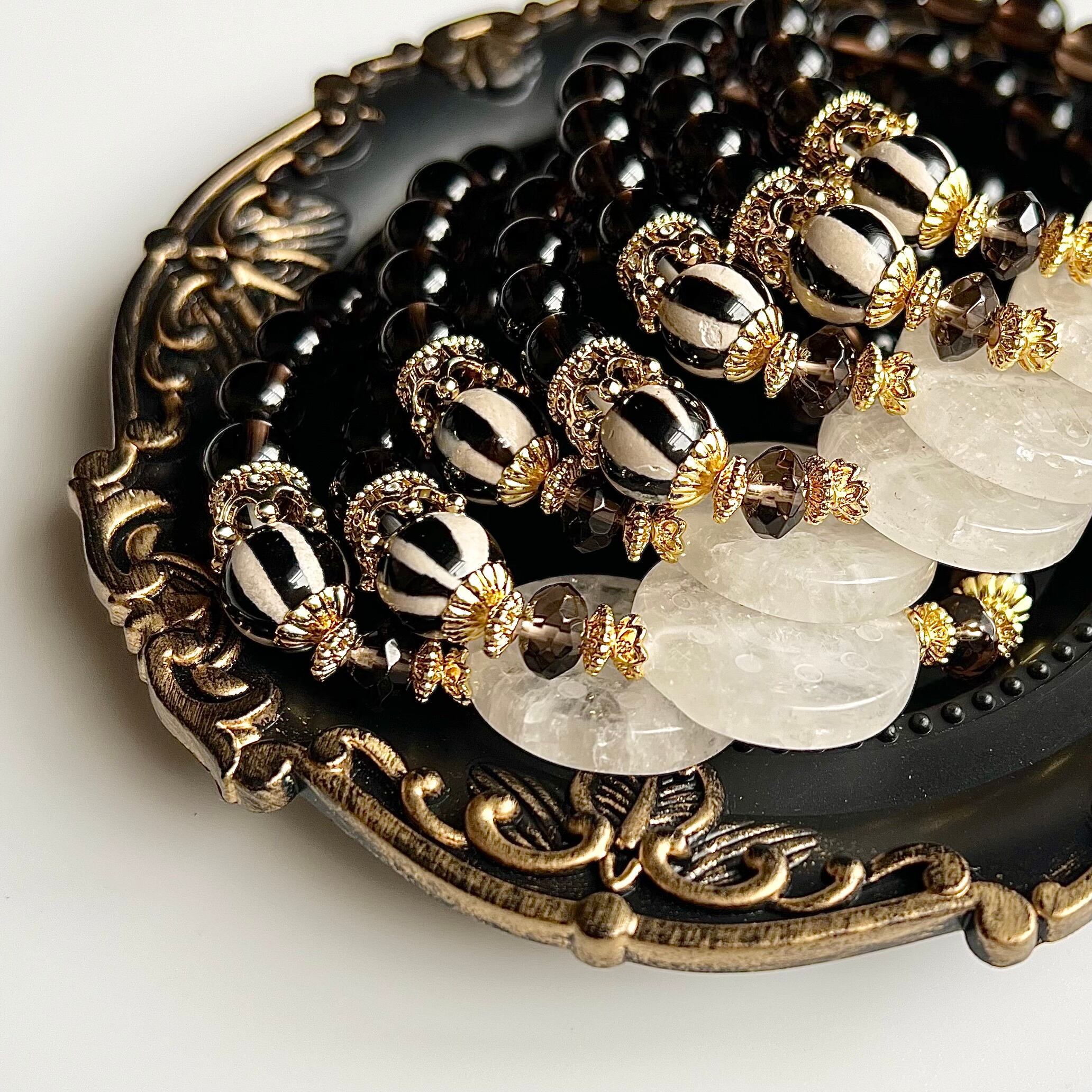 水晶とスモーキークォーツのモノトーンコンビとゴールドパーツの組み合わせがお手元をほど良く華やかにしてくれるので、大人の女性にオススメな一本です
