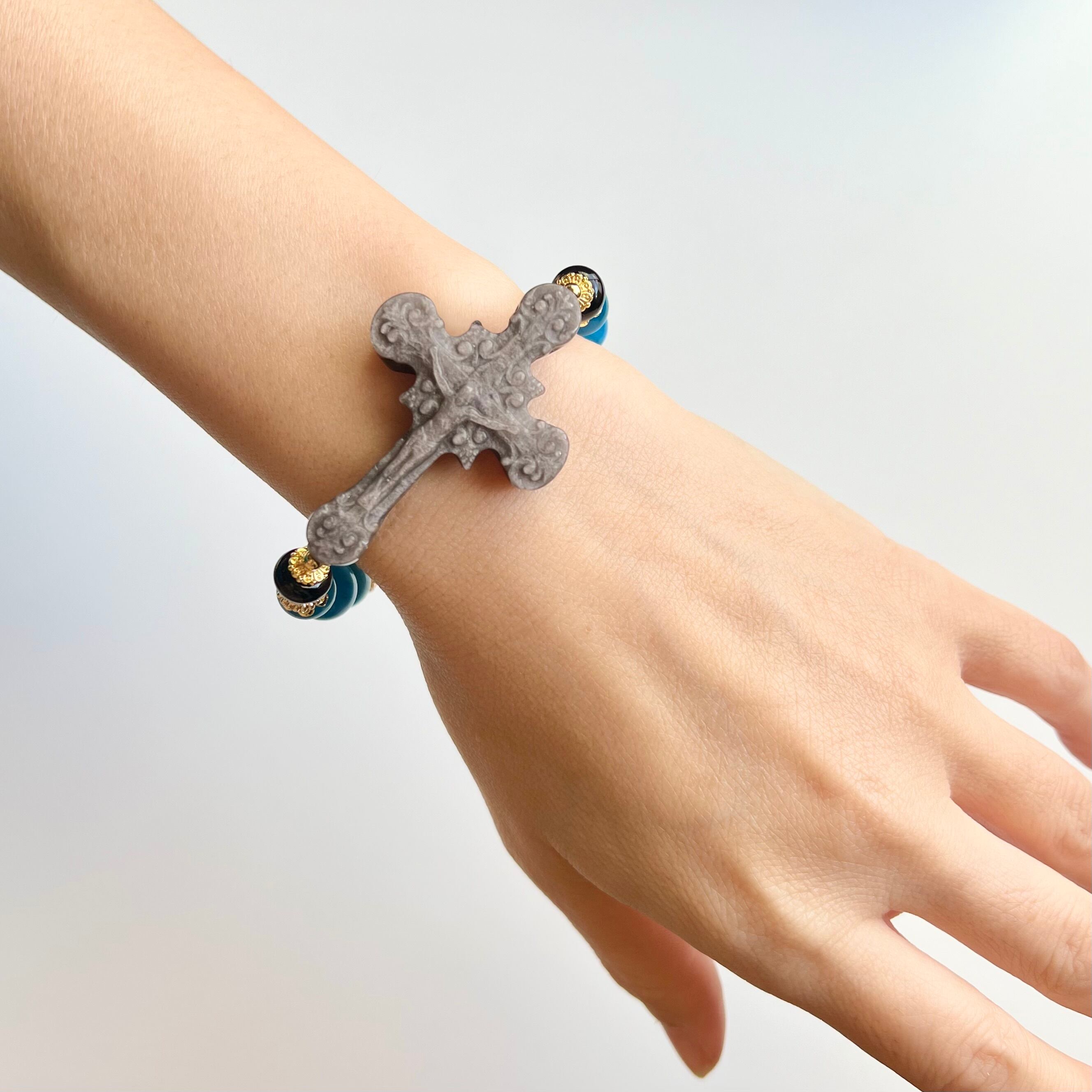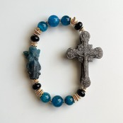 ブルーと黒のトロレアイトの天使が、十字架のシルバーオブシディアンとブレス部分に使用したアパタイトの良いつなぎ役になっています