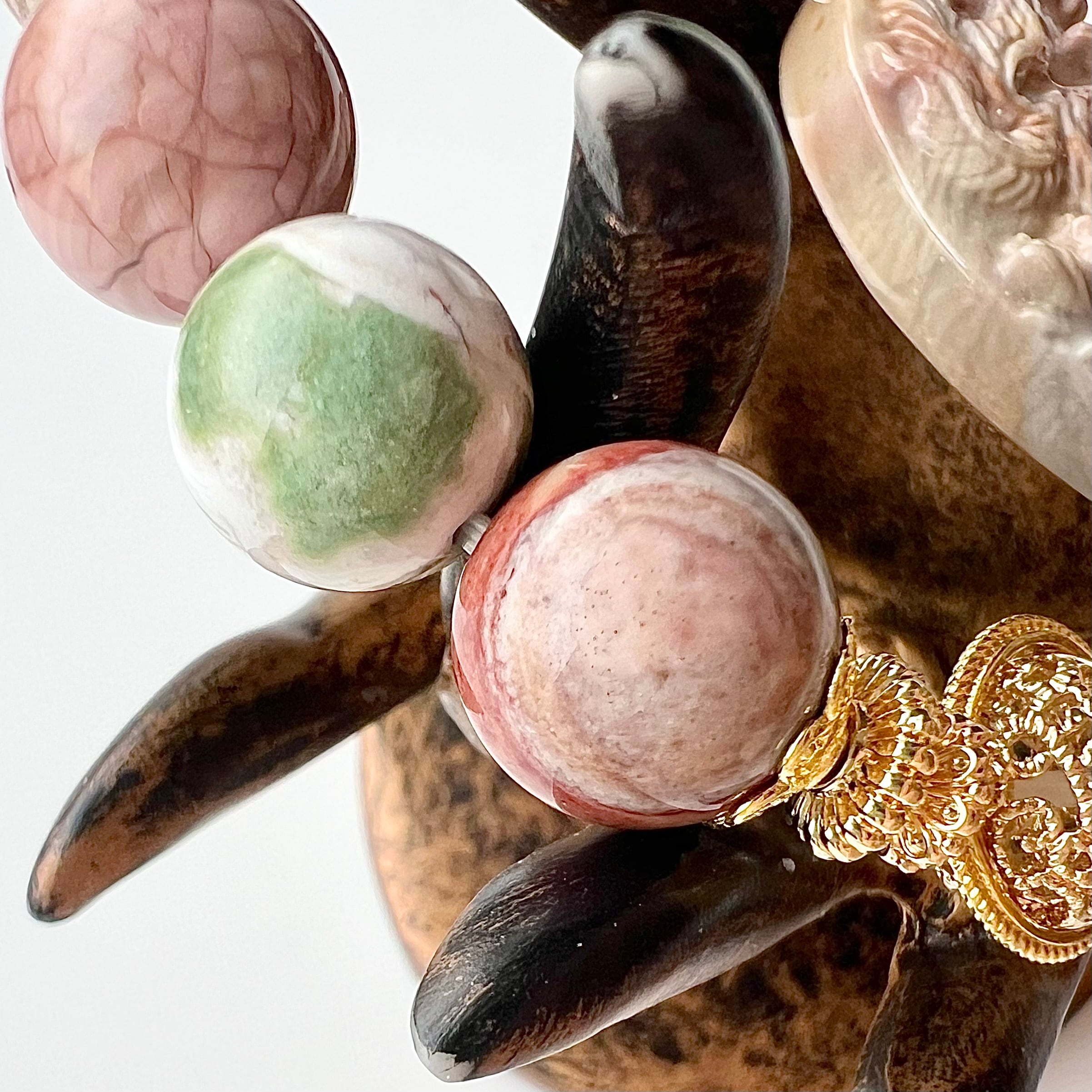 メインの九尾の狐はベージュ、薄ピンク、イエロー、グレーがマーブル状になったアラシャン瑪瑙に彫刻が施されています