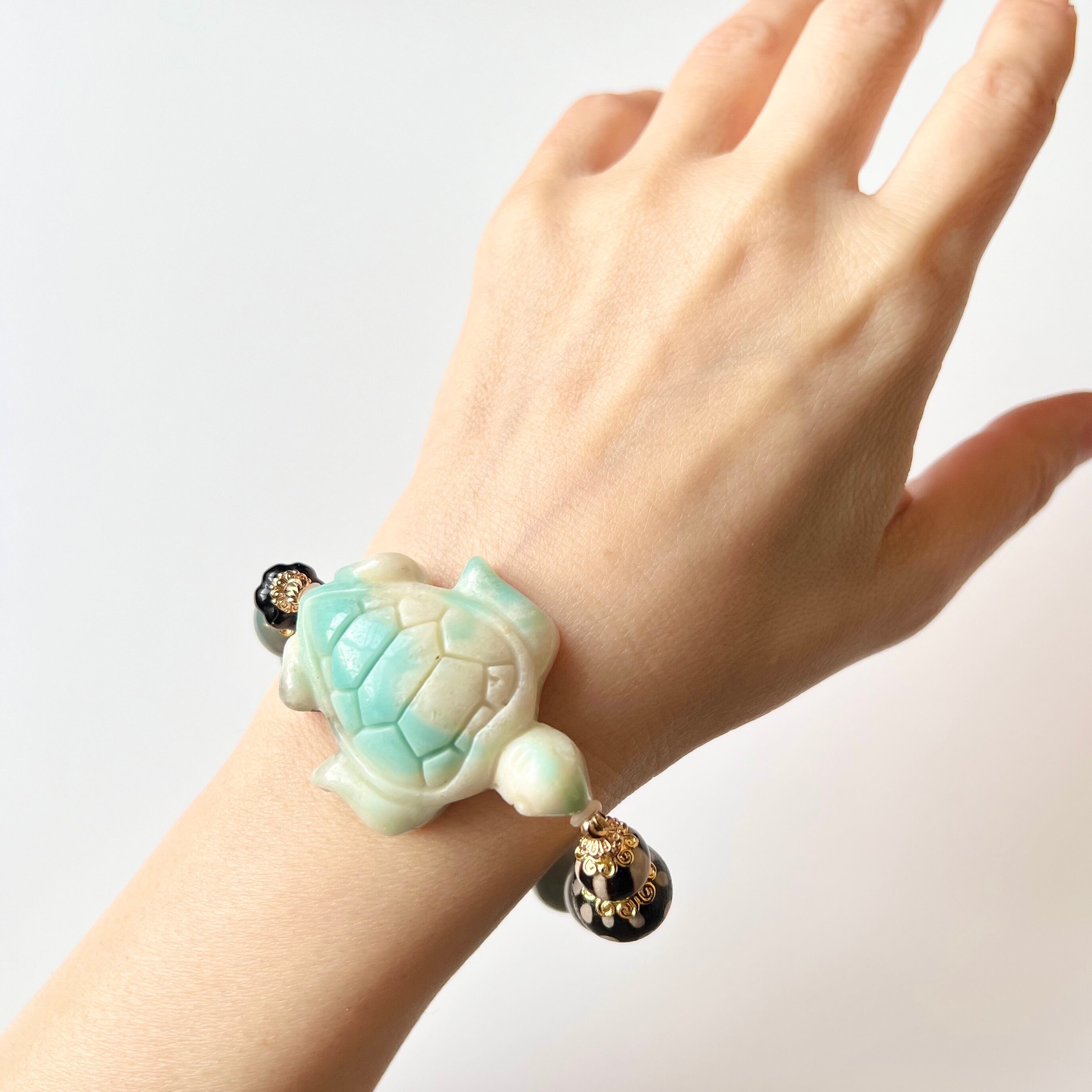 アマゾナイトの亀とブラックアクアマリンのデザインブレスレットです