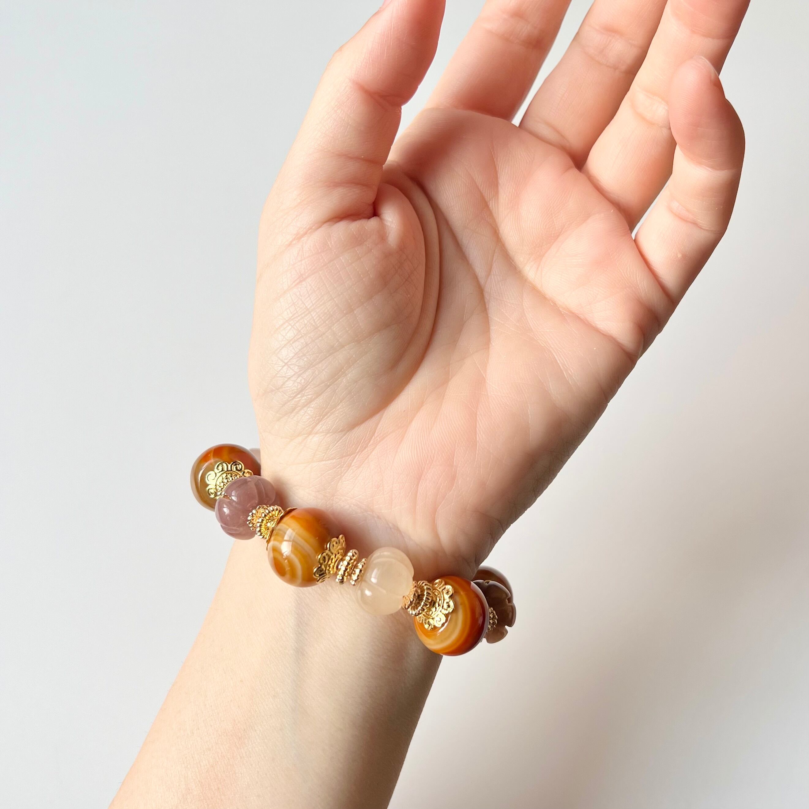 如意の中に蓮花が彫刻されたアラシャン瑪瑙と戦国瑪瑙のデザインブレスレットです