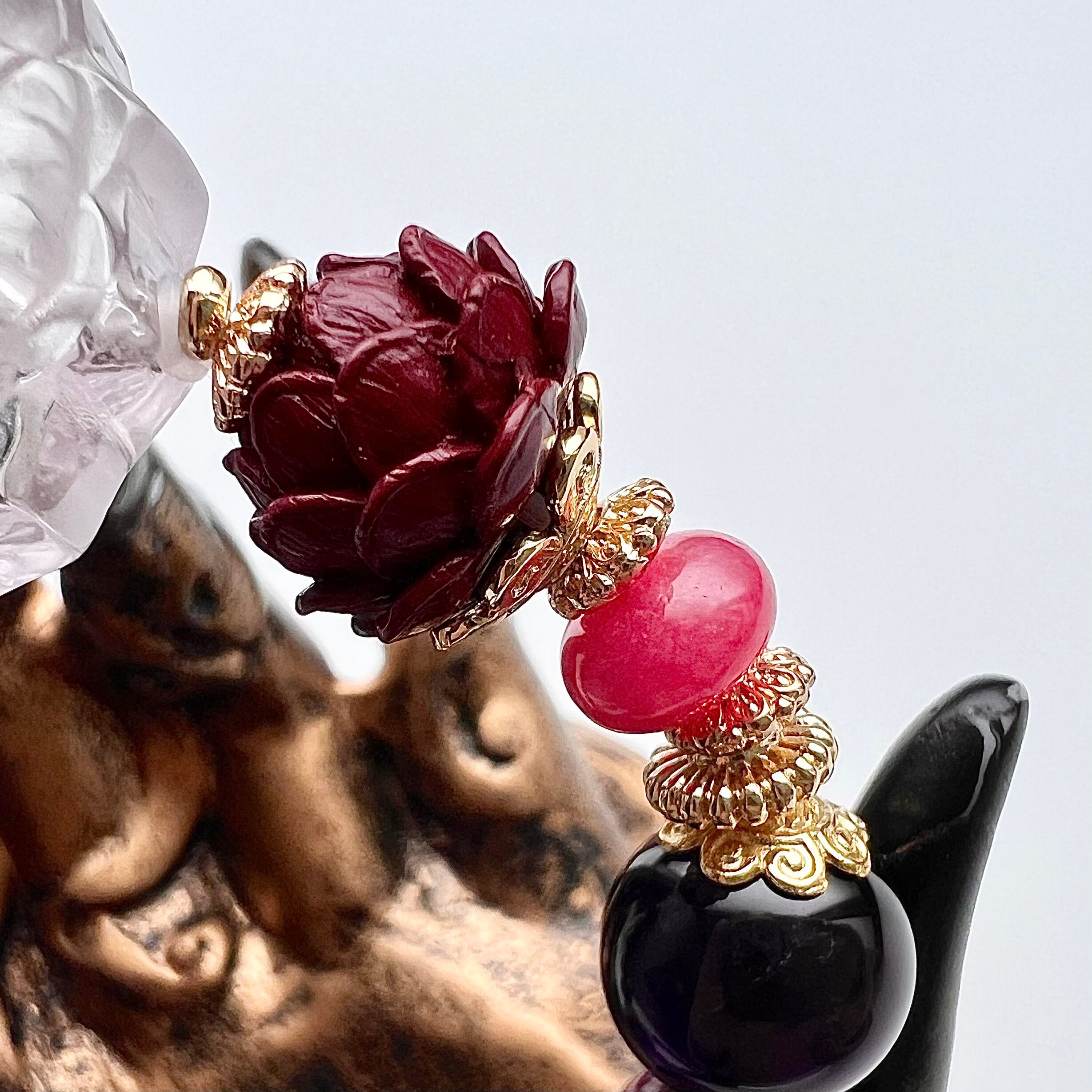 ブレス部分は濃い紫色のアメジストと、六字真言が刻印された菩提根を交互に並べました