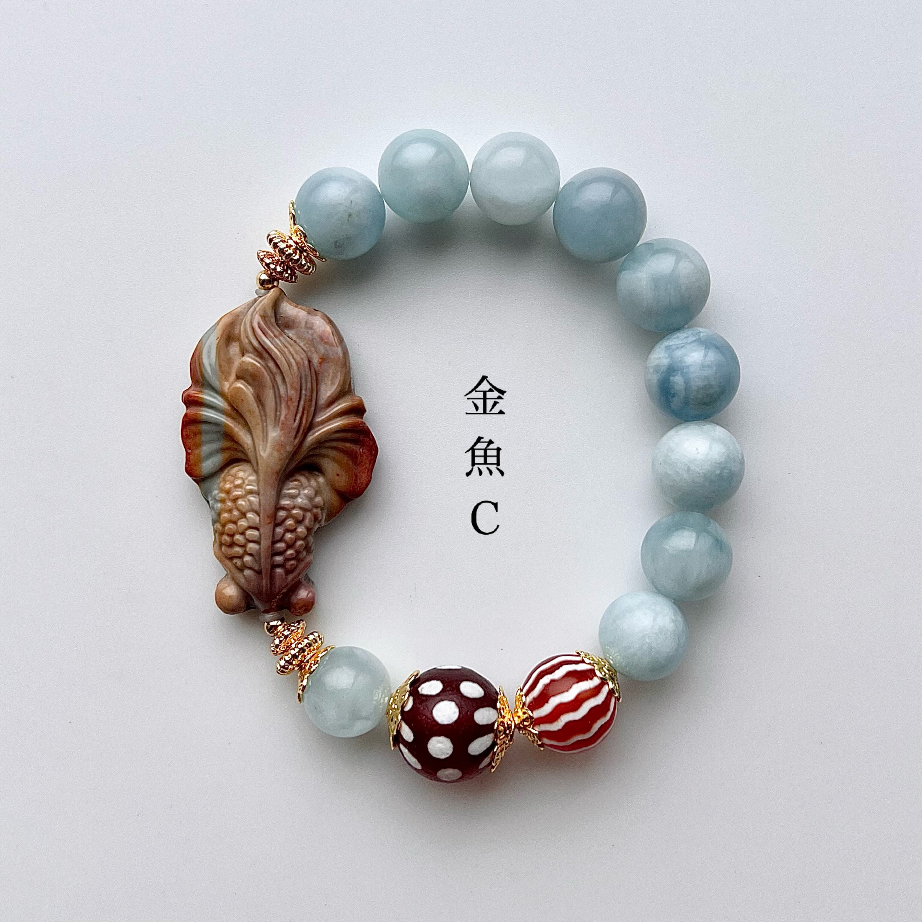 アラシャン瑪瑙の金魚とアクアマリンのデザインブレスレットです