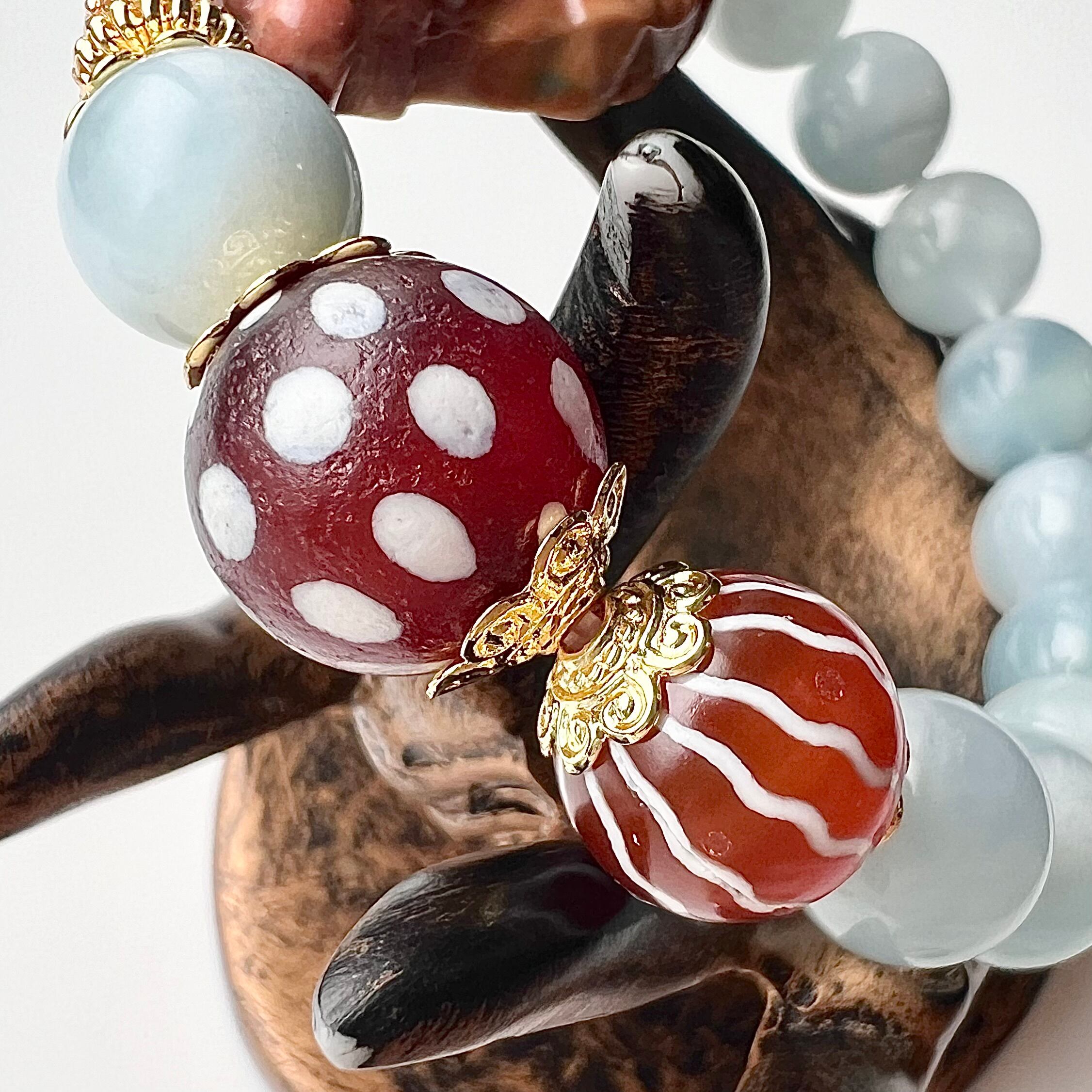 ブレス部分は水に見立てたアクアマリンと、浮き玉や水風船の代わりに満天天珠と波模様の天珠を使いました