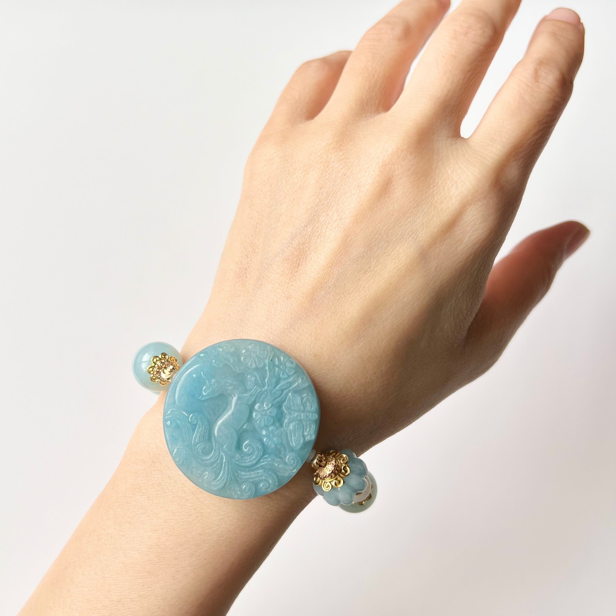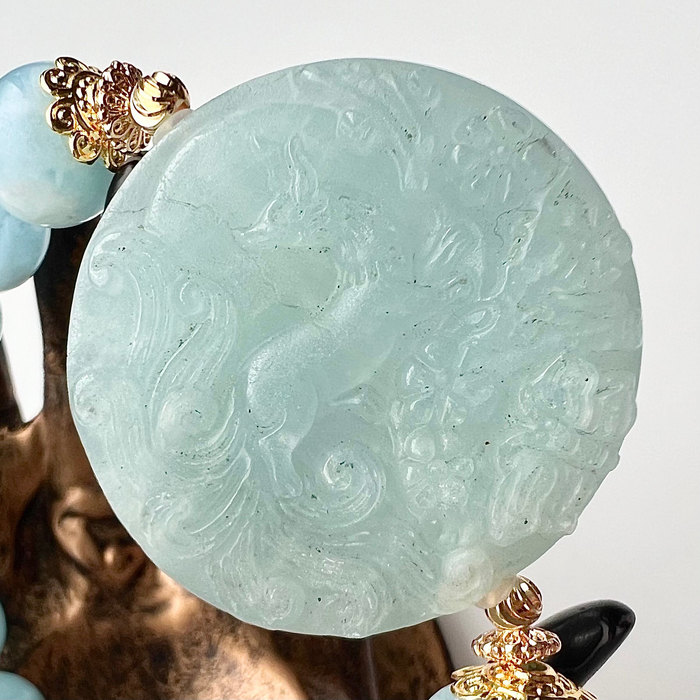 九尾の狐の彫刻が施されたアクアマリンとトロレアイトのデザインブレスレットです