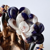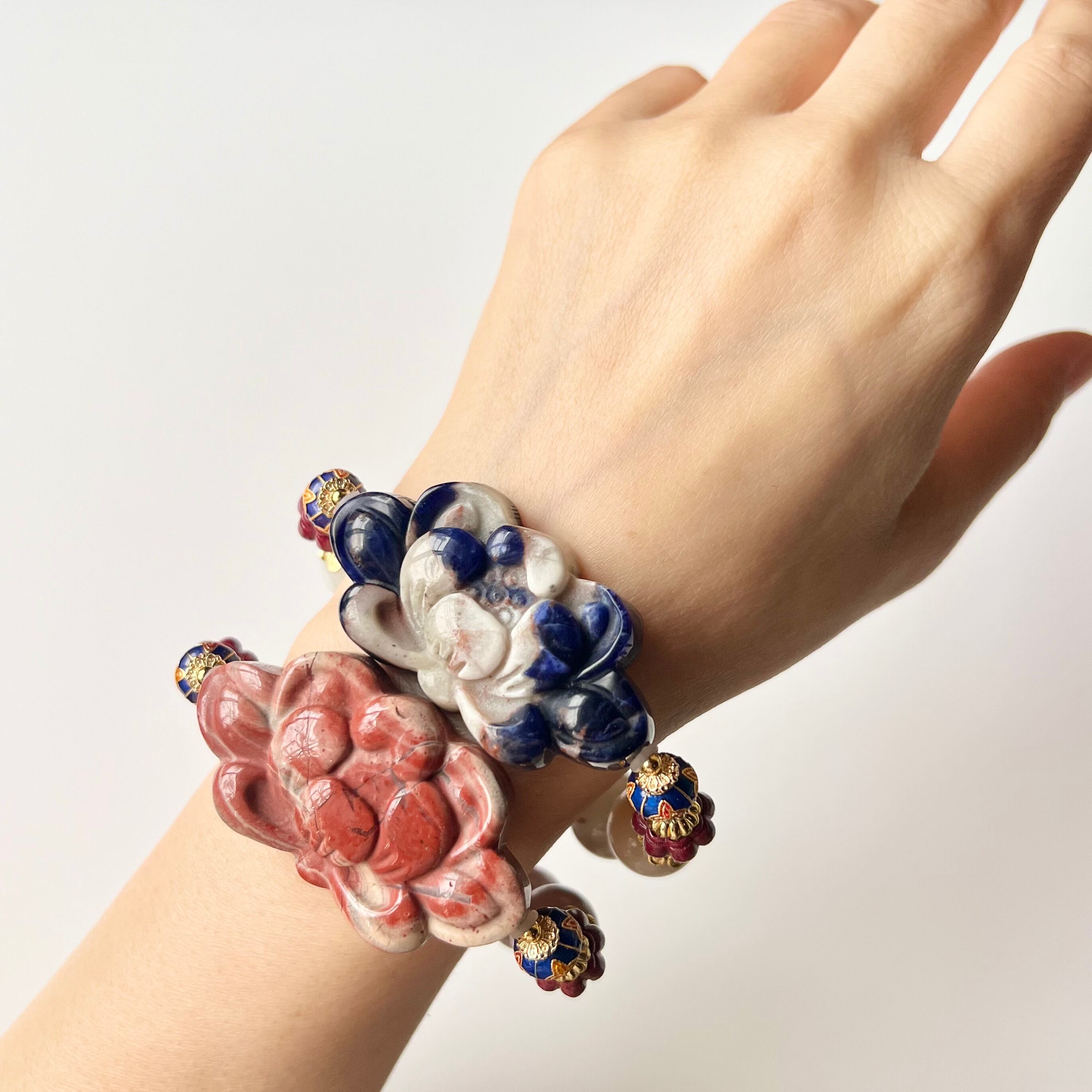 レッドジャスパーとソーダライトの蓮花彫刻をメインにしたデザインブレスレットです