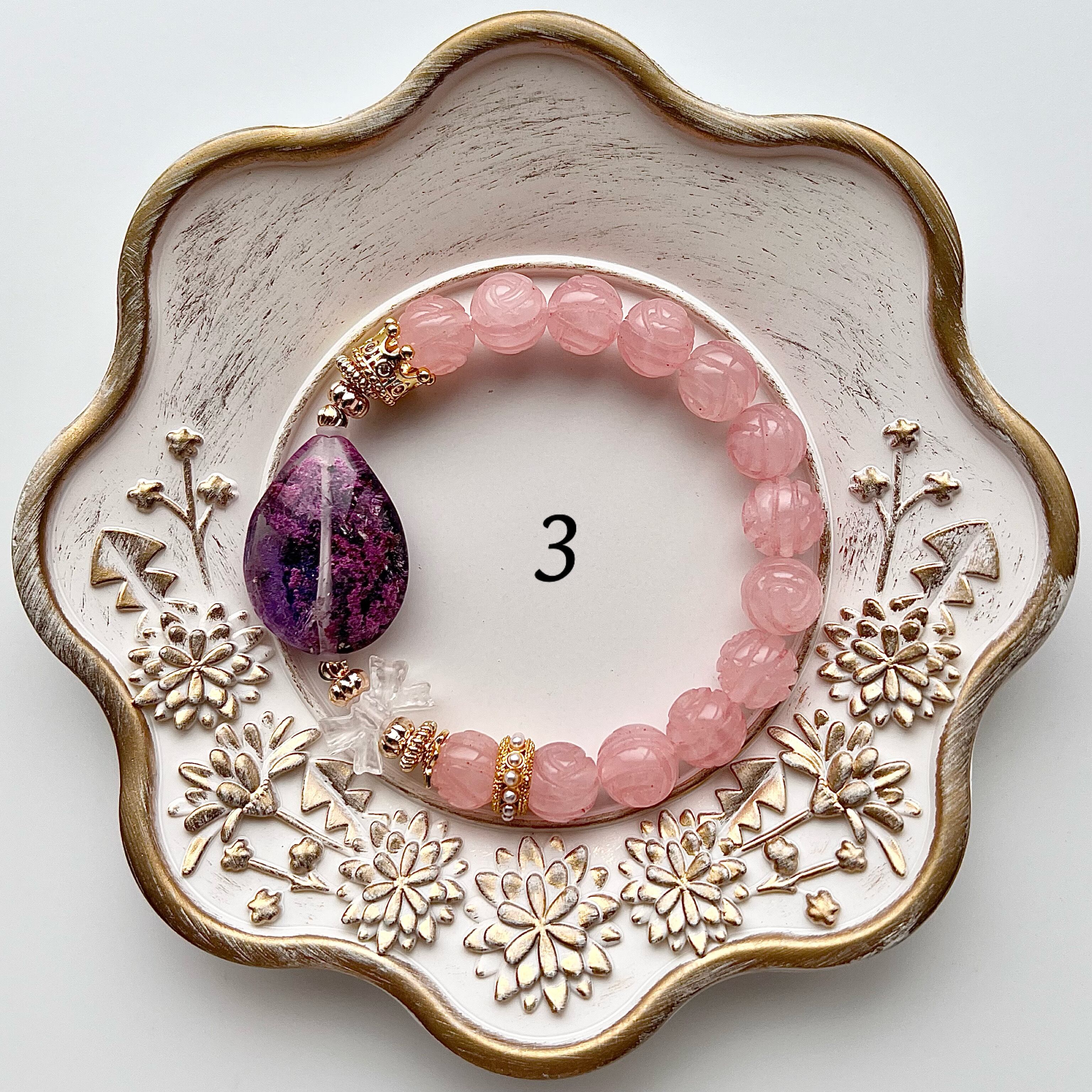 薔薇に見立てたピンクガーデンクォーツ(染色)とローズクォーツの薔薇彫りのデザインブレスレットです
