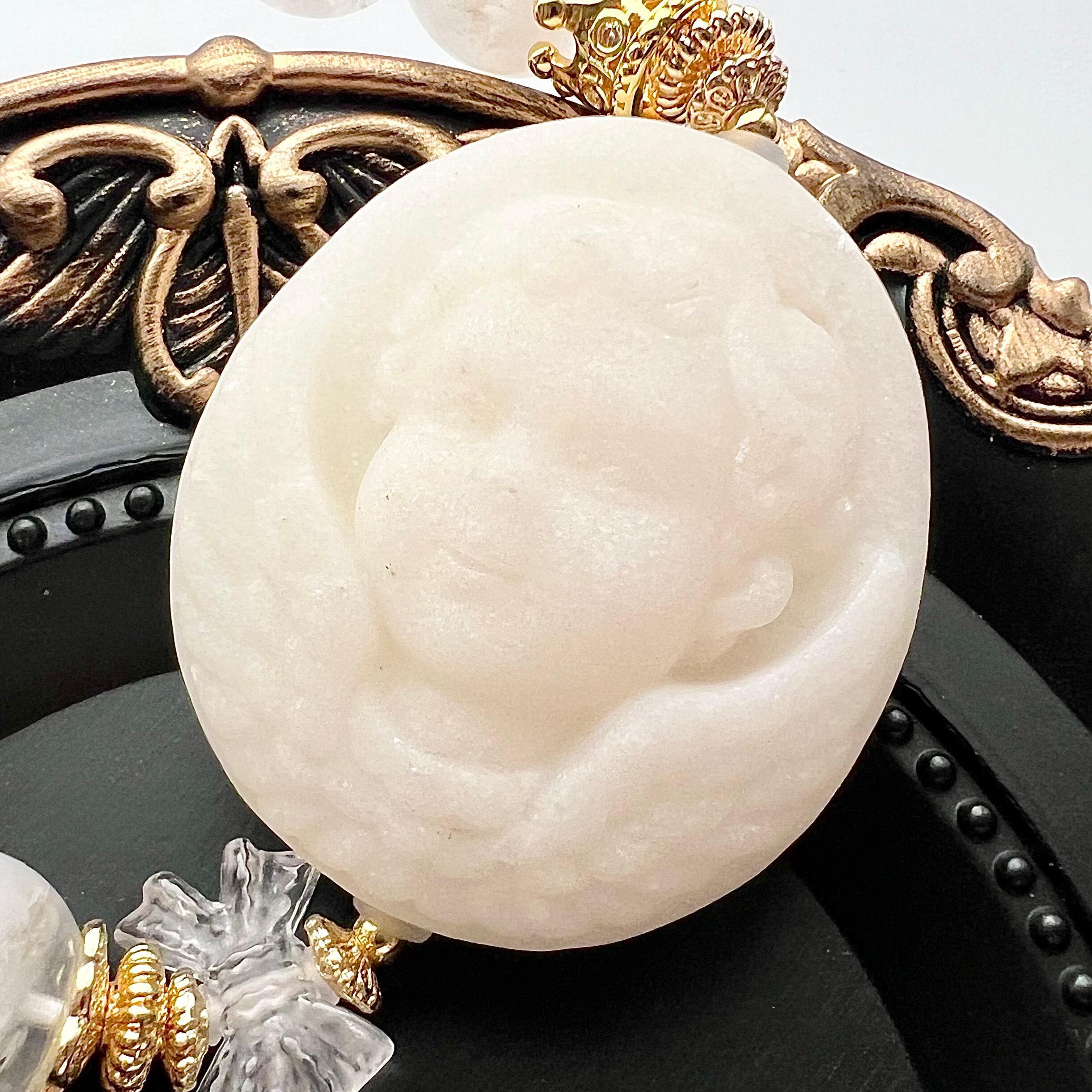 メインの大きなホワイトジャスパーには、かすかに微笑んだ天使のお顔の彫刻が施されています