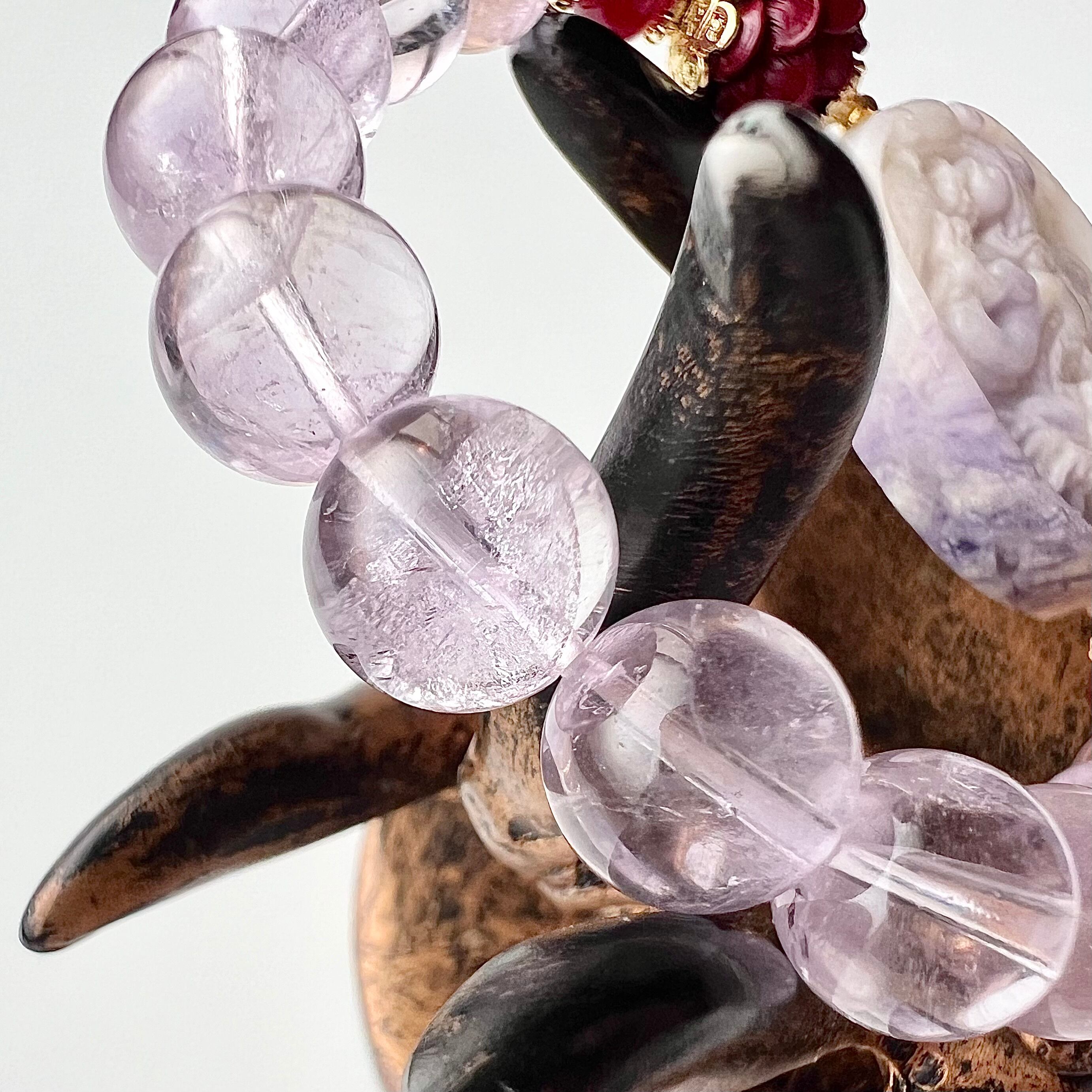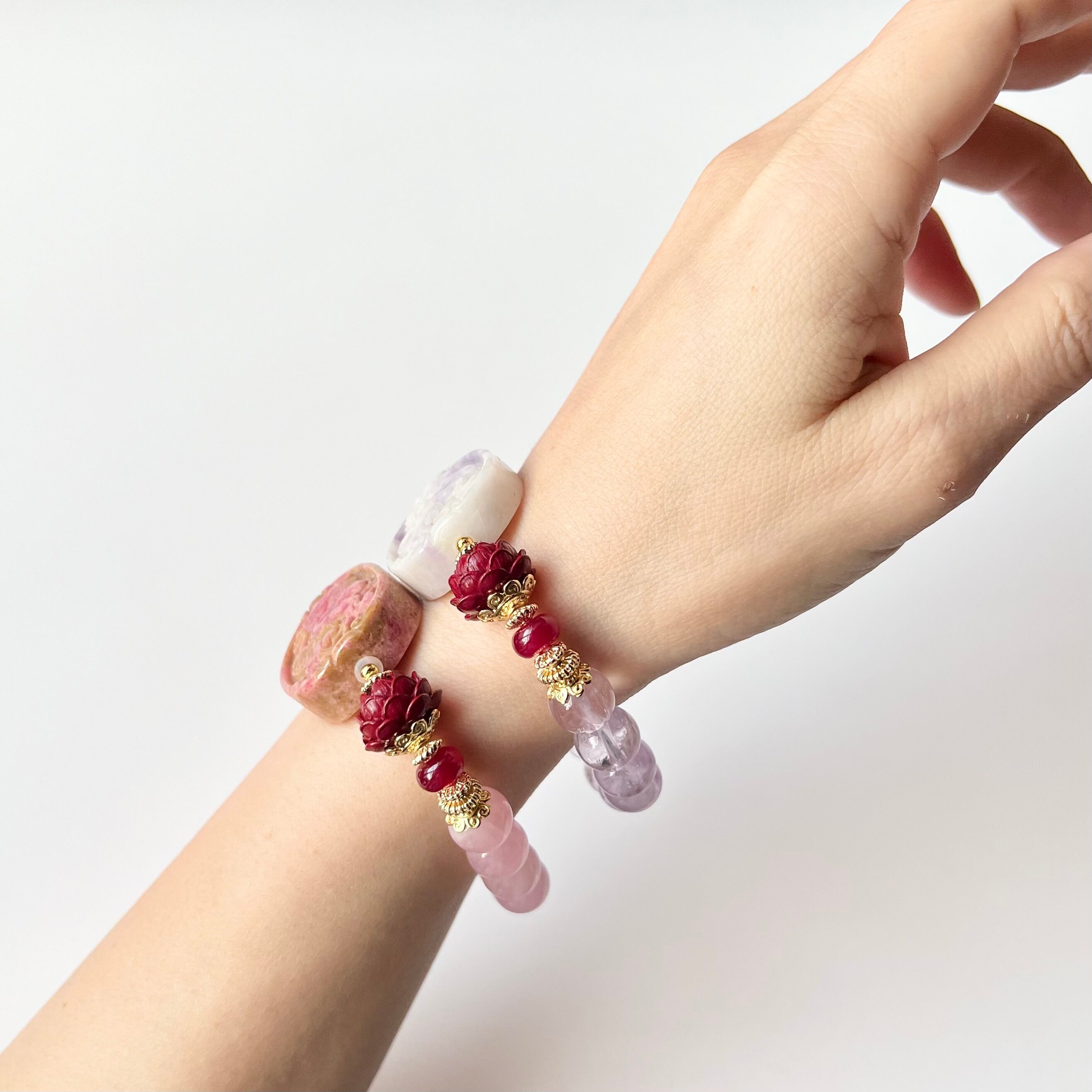 ブレス部分はラベンダーアメジストとディープローズクォーツをそれぞれ選びました