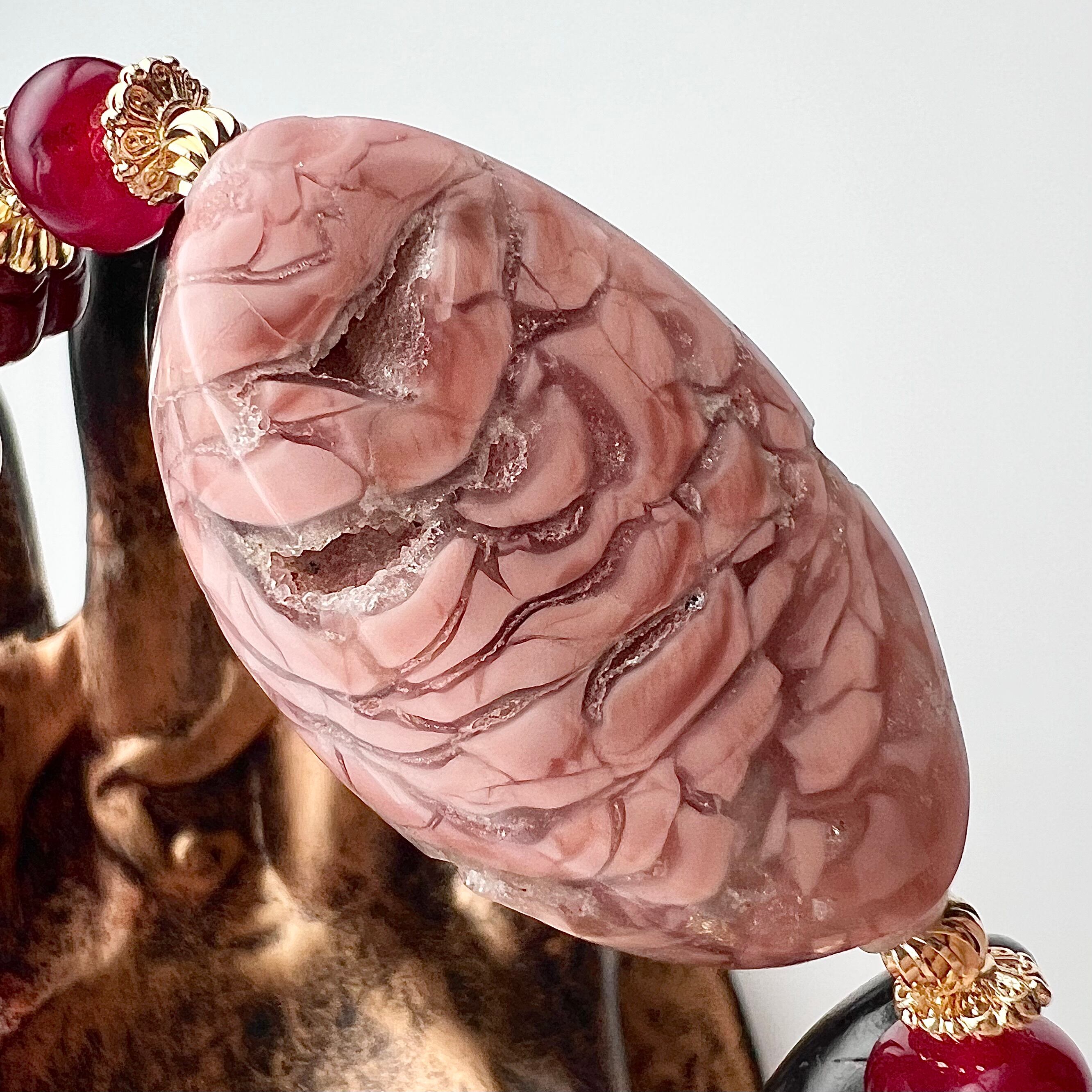 そしてこちらのピンクアラシャン瑪瑙は亀裂の間が結晶化したドゥルージーになっており、鉱物としてもお楽しみいただけます