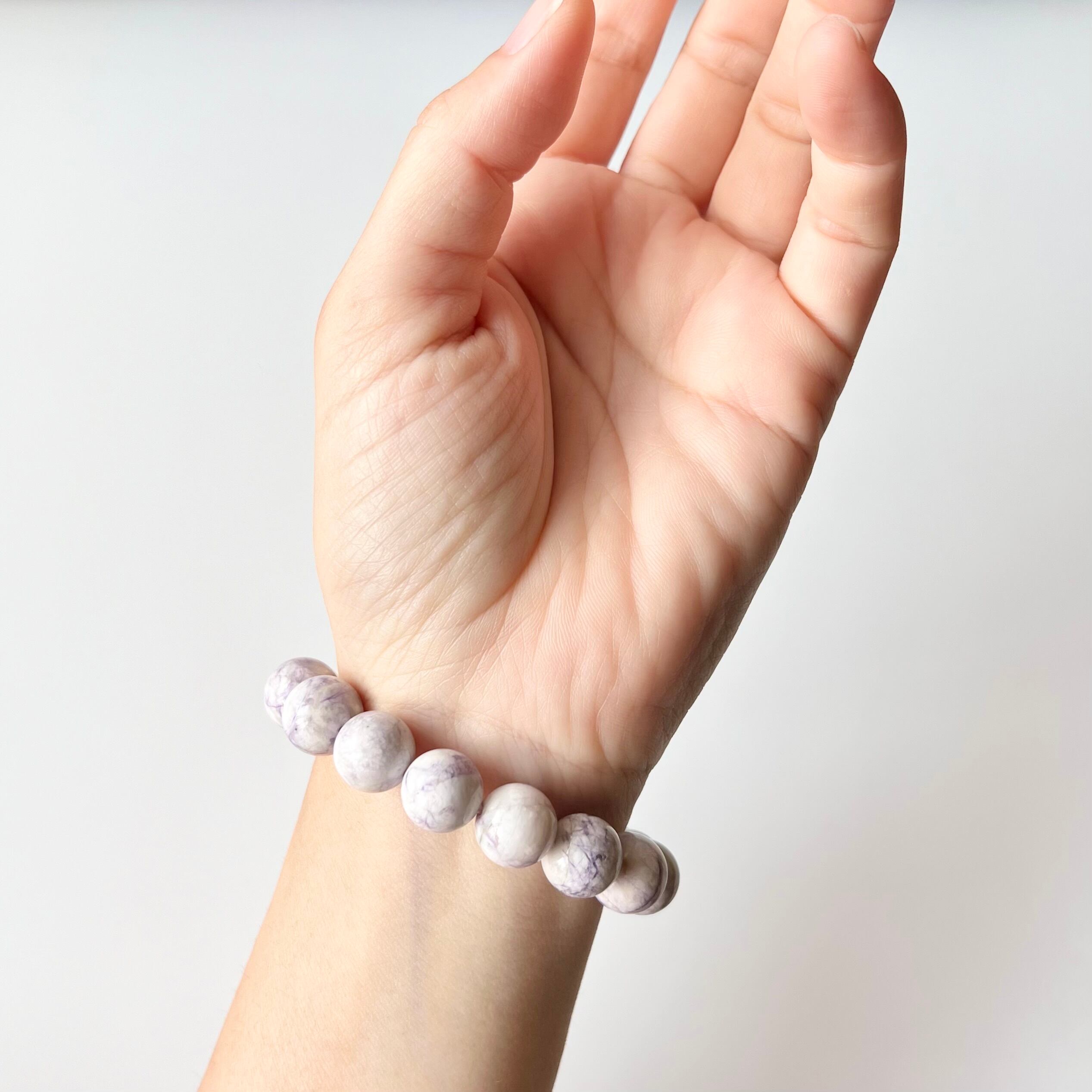白地にほんのり紫色が入った、上品で優しい印象のパープルハウライトです