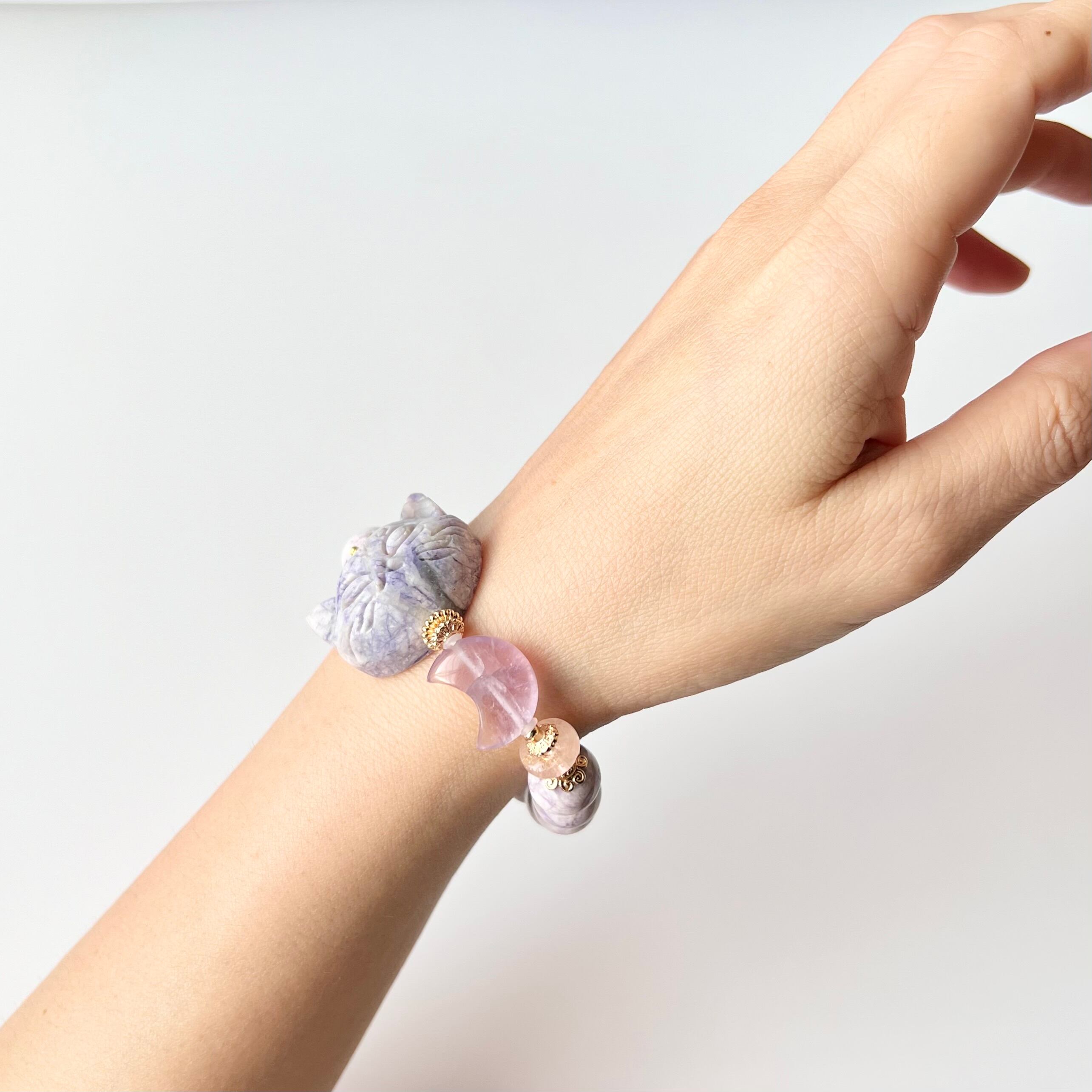 夜になり我が物顔で歩く猫の姿をイメージして、猫の頭に王冠を載せ、下にはラベンダーアメジストの三日月をあしらいました