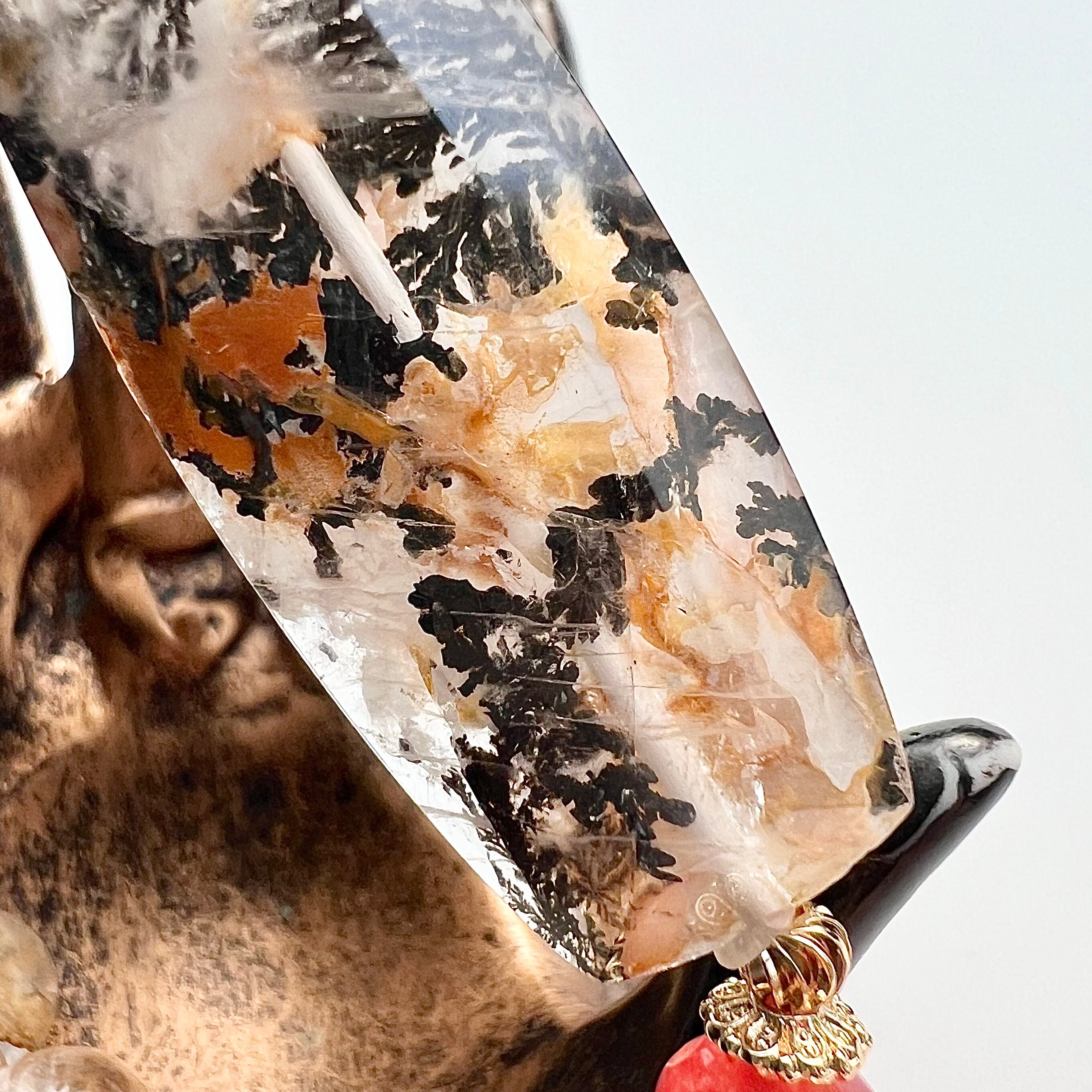 メインの長方形のデンドリティッククォーツには、水晶の中に黒くハッキリしたデンドリや鉄分と思われるオレンジ色が内包されています