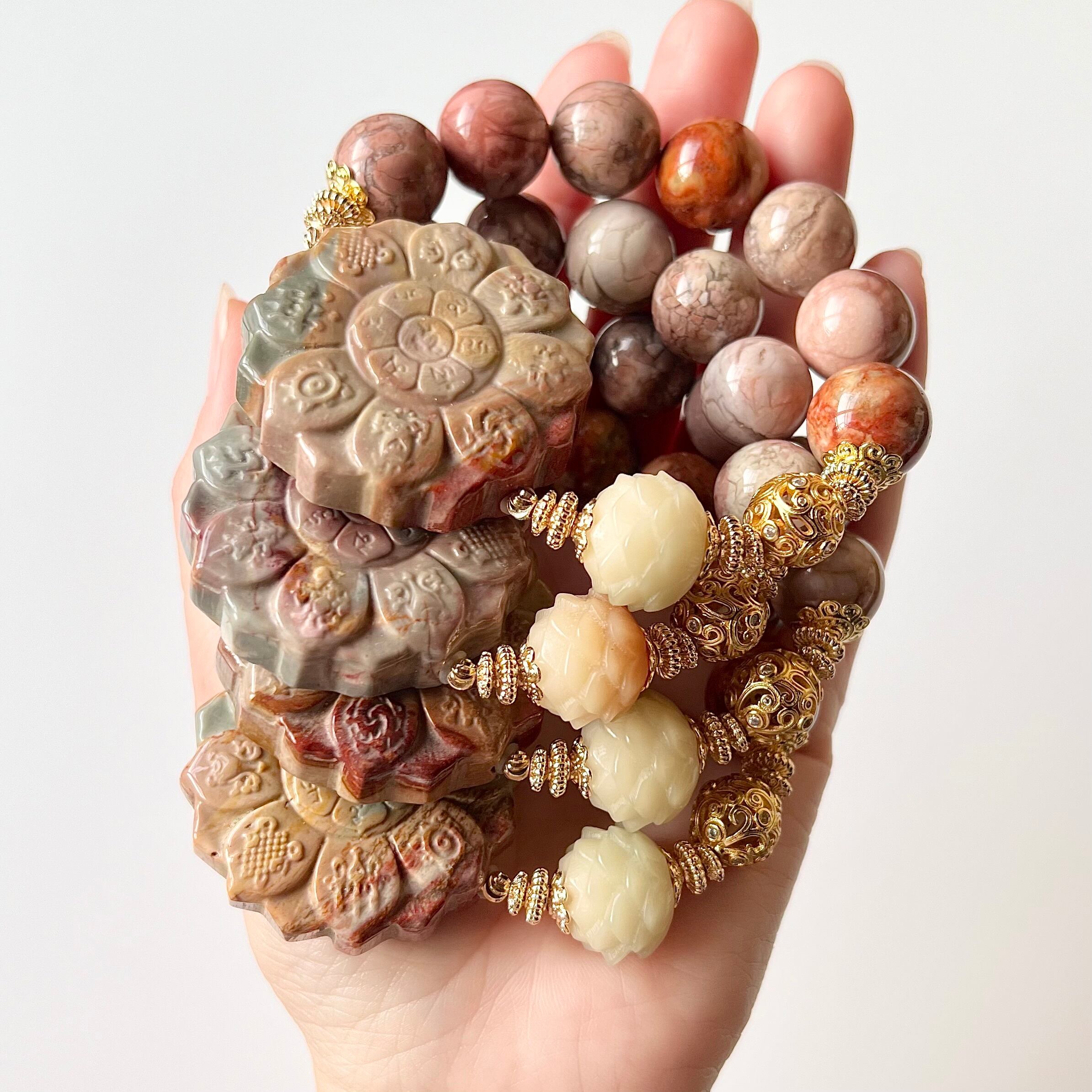 ブレス部分も蓮華座の雰囲気に合わせた大玉アラシャン瑪瑙を各種選びました