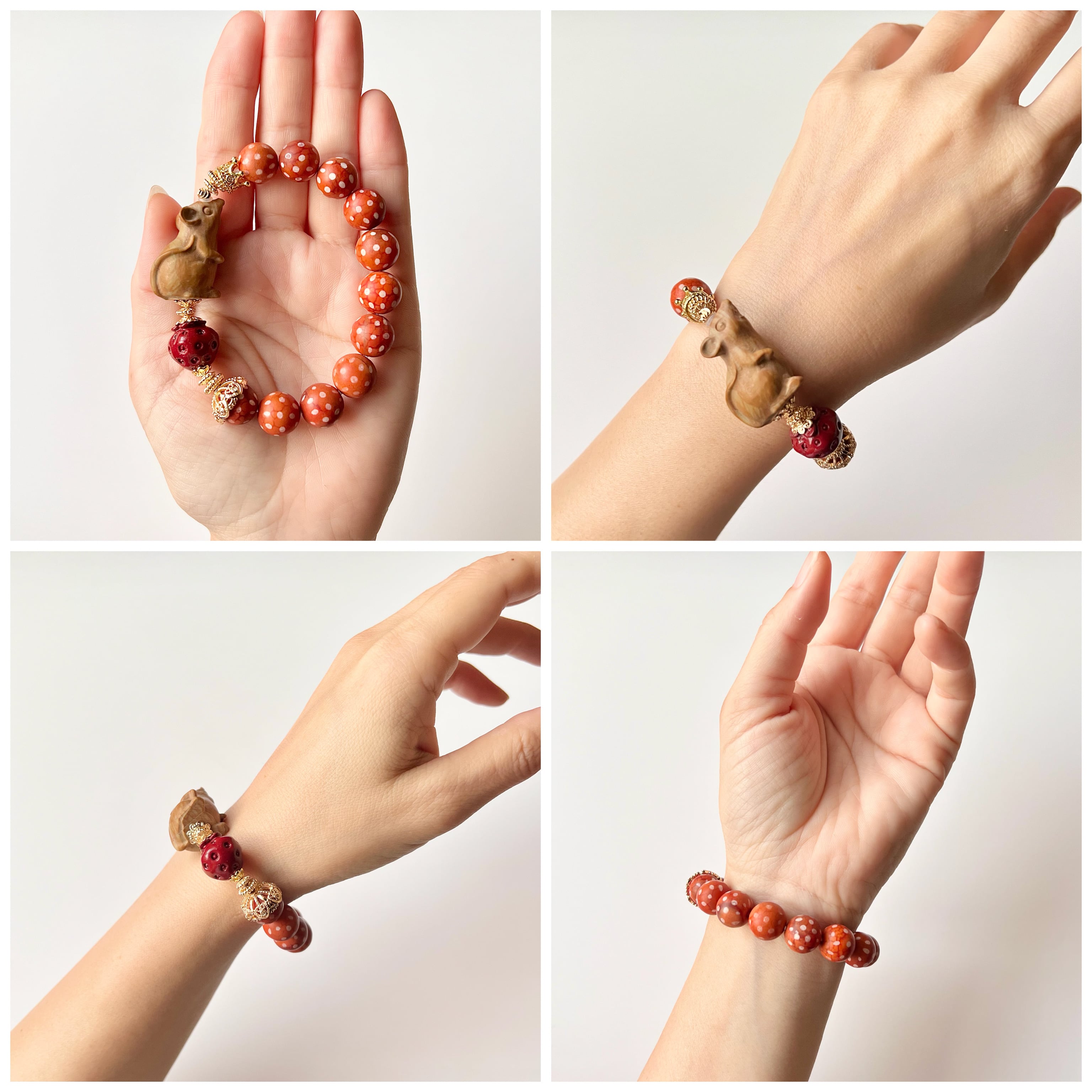 アラシャン瑪瑙のねずみのブレス部分には苺の粒々をイメージした、水玉模様が可愛い満天天珠をそれぞれ選びました