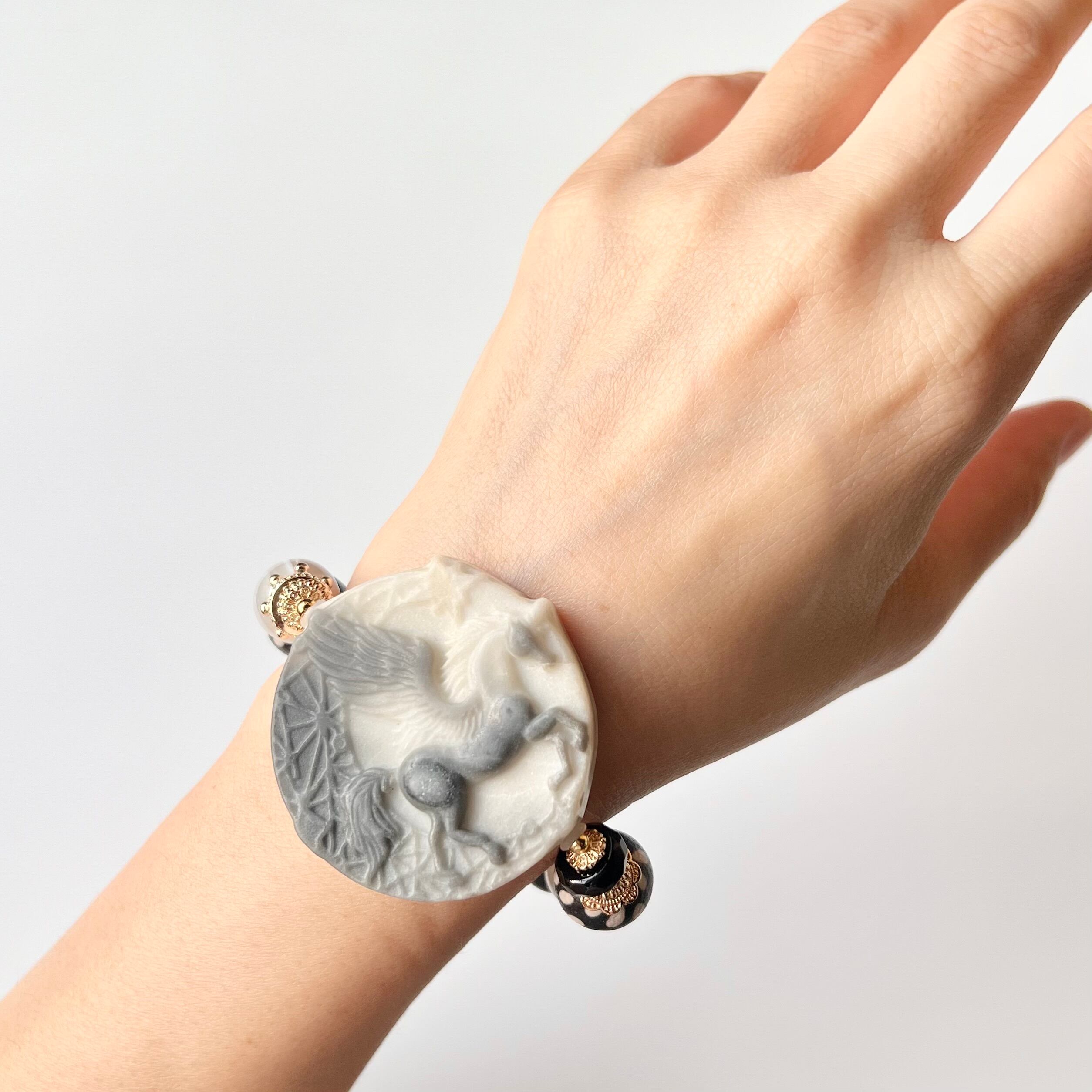 大きな太極石のペガサス彫刻と、水玉模様が可愛い満天天珠のデザインブレスレットです