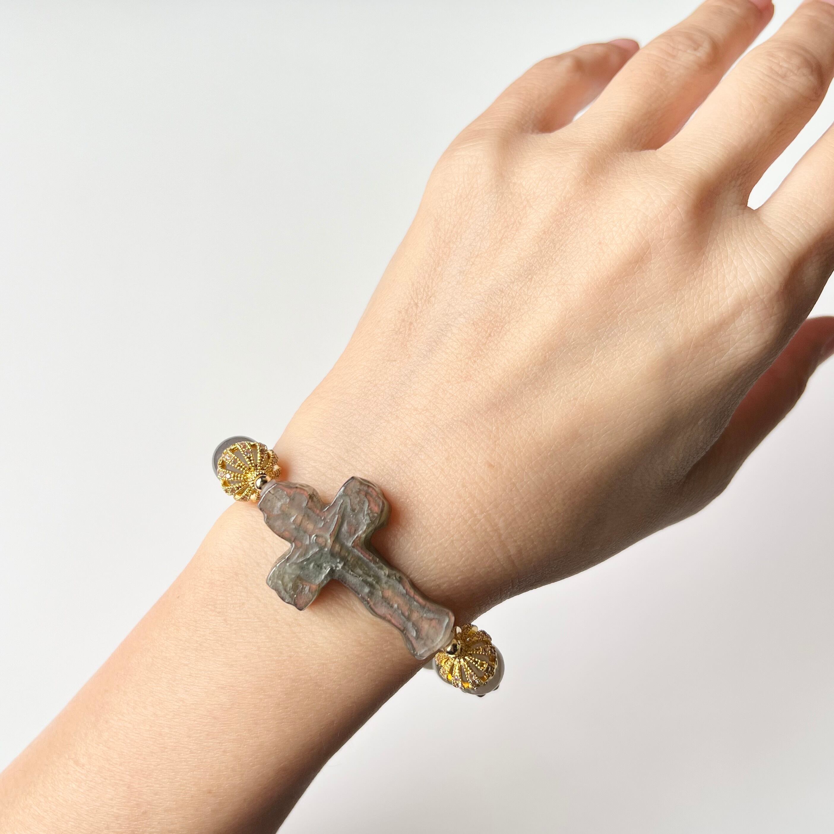 十字架の彫刻をメインにしたラブラドライトデザインブレスレットです