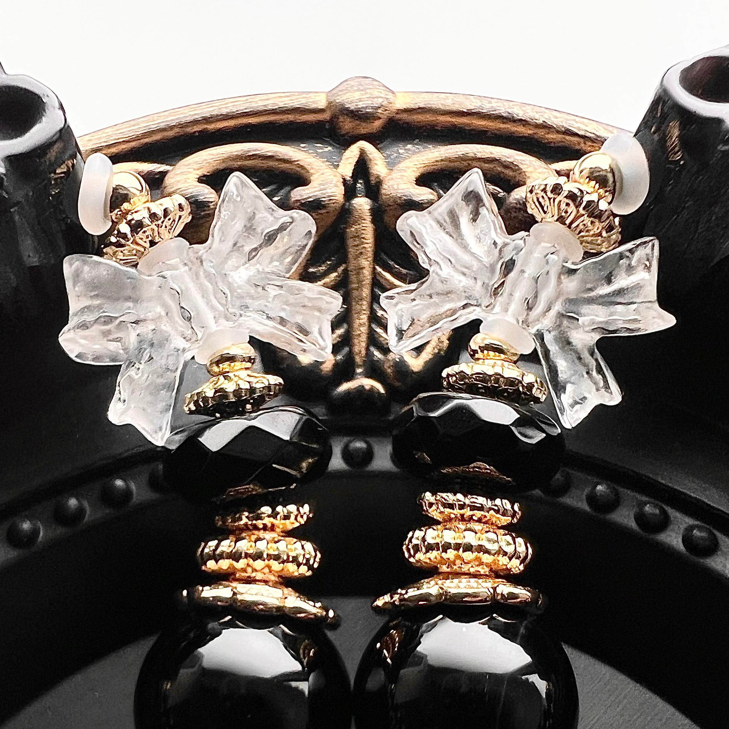 他にも王冠のゴールドパーツや水晶のリボンをあしらい、モノトーンながら華やかな印象のブレスに仕上げました