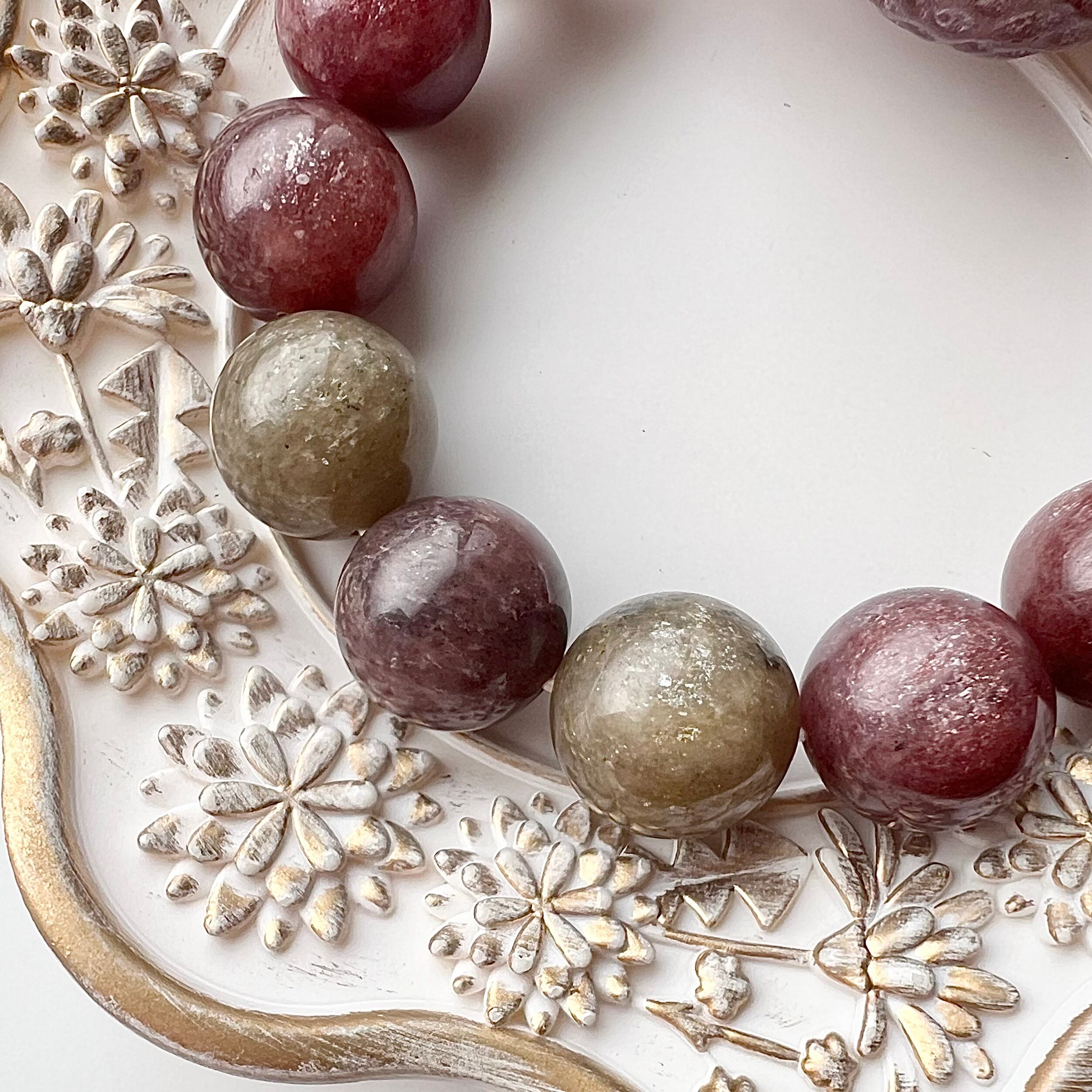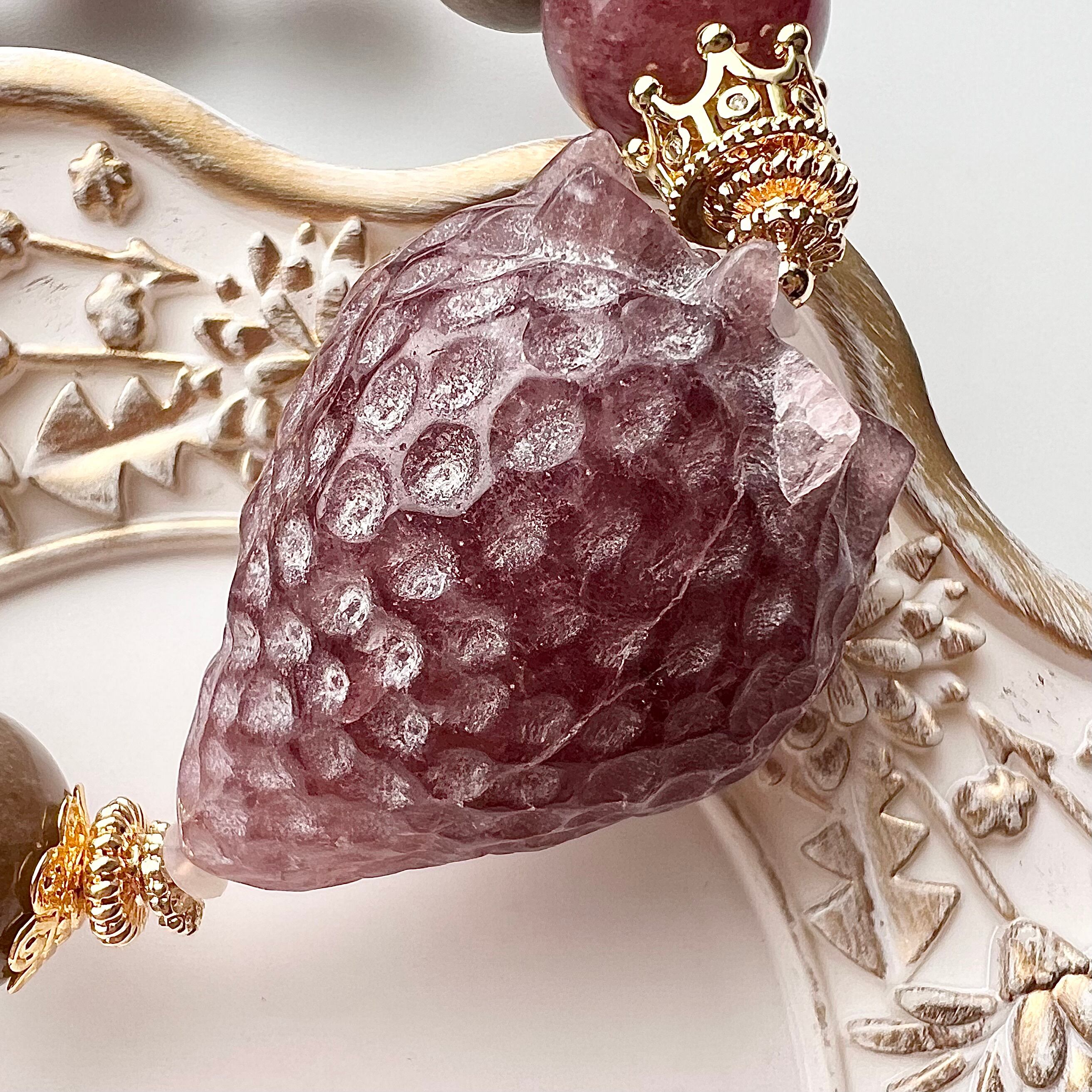 ブレス部分は木の実を思わせる、くすみカラーのストロベリークォーツを使用