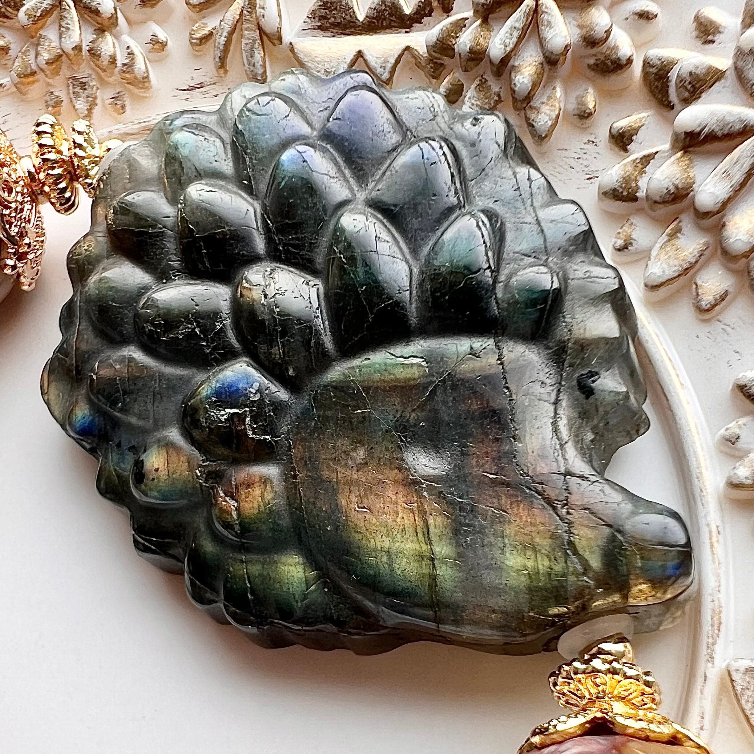 メインのハリネズミはイエロー、オレンジ、グリーン、ブルーのシラーがあらわれるレインボーラブラドライトです
